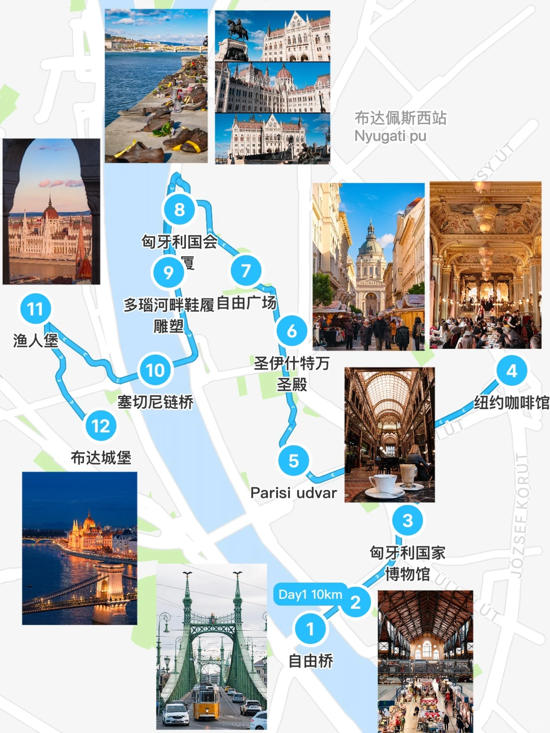 纽约咖啡馆➡️中央市场➡️自由桥➡️伊丽莎白桥(自由山)爬山可放弃➡️万圣殿➡️自由广场➡️国会大厦➡️多瑙河之履➡️链桥➡️渔人堡➡️马加什教堂➡️布达佩斯城堡(蓝调同框机位)