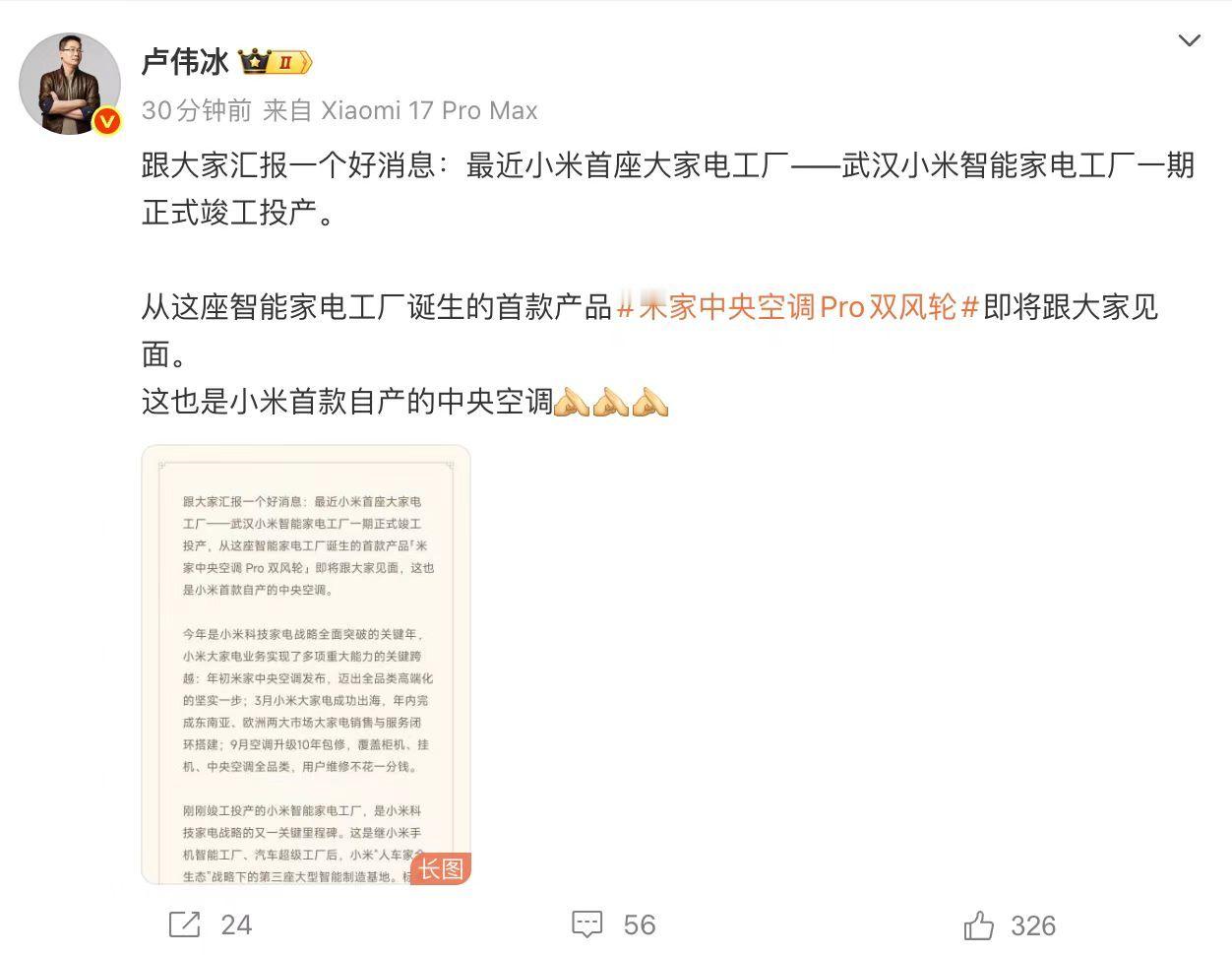 卢伟冰宣布小米将发布自产中央空调12月11日,小米集团合伙人、总裁,手机部总裁,小米品牌总经理卢伟冰发文称,小米首座大家电工厂——武汉智能家电工厂一期正式竣工投产,首款自研产品“米家中央空调Pro双风轮”同步官宣,这也是小米首款自产中央空调产品。