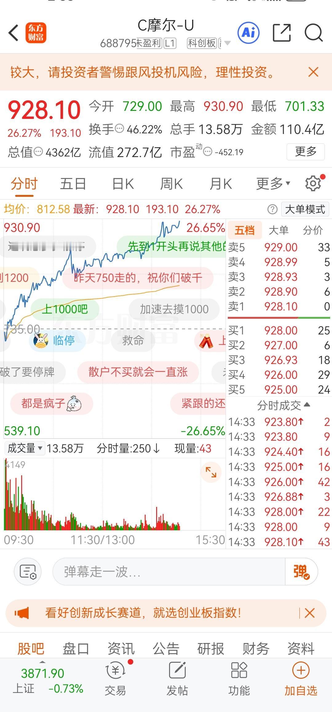 摩尔线程上市第一天按照发行价114里计算第一天就翻了五倍,三天之后再次翻倍价格来到了最高938!市值4400亿了,对标英伟达两万亿,还早的很呢,不晓得到多少倍才对,这就是价值投资,对吗?