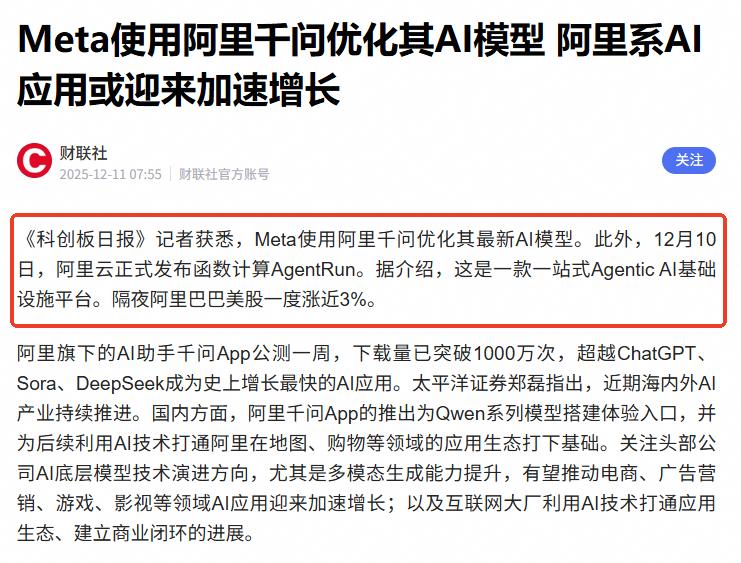 开源世界的权力交接,这一次发生在中美AI之间。 据彭博社披露,Meta正在秘密研发的新模型“牛油果”,已确定引入阿里千问Qwen的开源模型作为核心学习对象。这家曾以Llama系列统治开源世界的硅谷巨头,如今将目光投向东方。 市场总会提前感知风向变化——消息传出当天,阿里巴巴盘前股价跃升超过4%。这种反应并非空穴来风,数据已经预示了这一转变:千问Qwen不仅在全球性能榜单上屡次登顶,更在关键的开源生态指标上完成对Llama的双重超越——先是在衍生模型数量上领先,接着在下载量上实现反超。 黄仁勋那句“中国在开源领域遥遥领先”,此刻听来更像是产业格局变迁的预告。当Meta这样的开源先驱转向借鉴中国模型,某种程度印证了技术领域的“东风西渐”正在成为现实。 这个故事的戏剧性在于,就在不久前,扎克伯格还在公开场合强调“支持美国模型”。如今Meta研发团队的行动,展现出科技界最朴素的价值观:在真正的技术实力面前,地域界限正在模糊。 更具启示意义的是开源与商业的良性循环正在形成:千问的开源模型在技术社区获得认可的同时,其C端应用以23天3000万月活的速度迅猛增长。技术突破与产品落地形成闭环,既赢得开发者尊重,又获得用户认可。 开源世界的竞争早已超越单纯的技术参数对比,而演变为生态繁荣度的较量。当全球开发者开始围绕中国模型构建创新应用,当行业巨头主动将其纳入核心研发流程,这意味着中国AI不仅输出了代码,更开始输出技术标准与创新范式。 或许,这是中国开源技术走向世界的真正开端。在硅谷的实验室里,来自中国的开源代码正在被认真研究、提取精华——这比任何榜单名次都更能说明问题。技术创新没有国界,但创新源头的位置,正在地图上缓慢而坚定地移动。