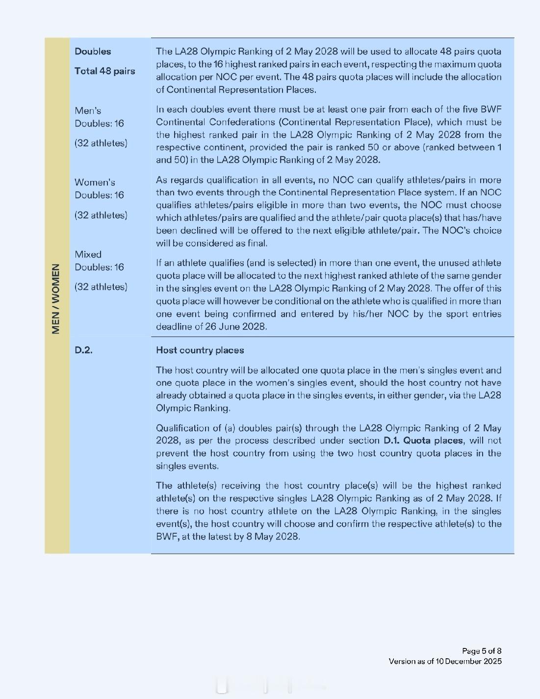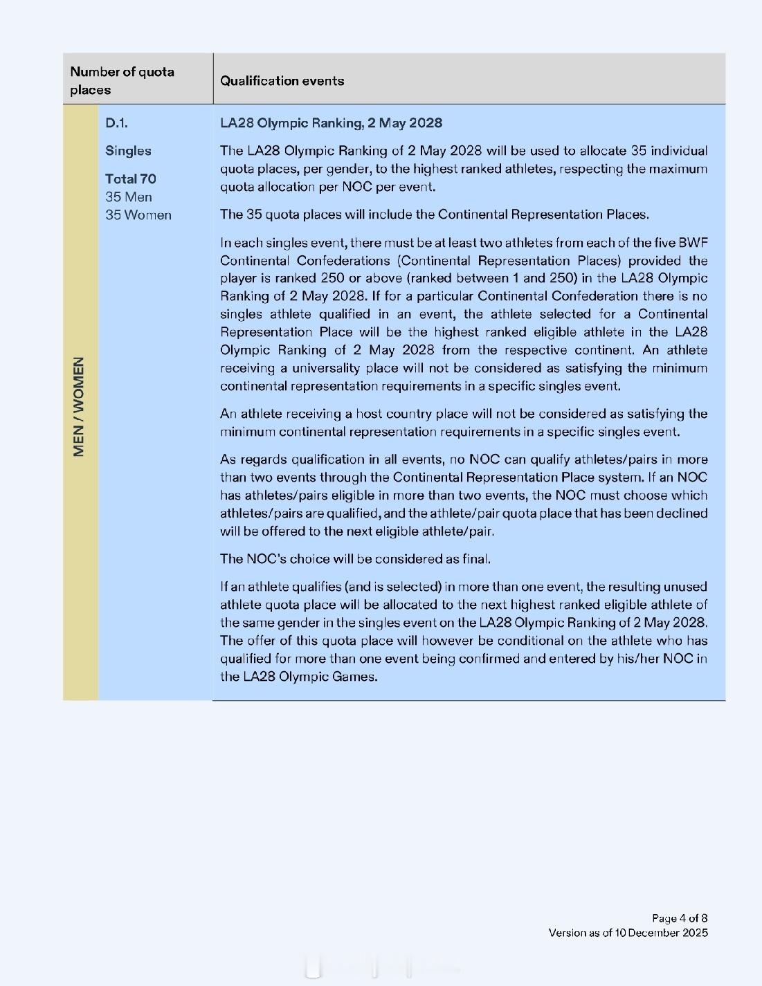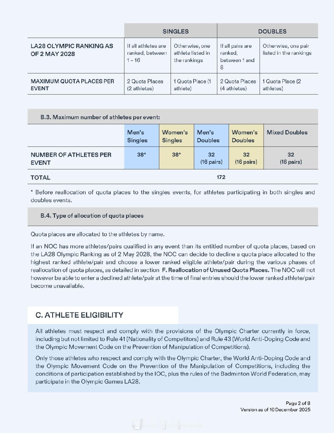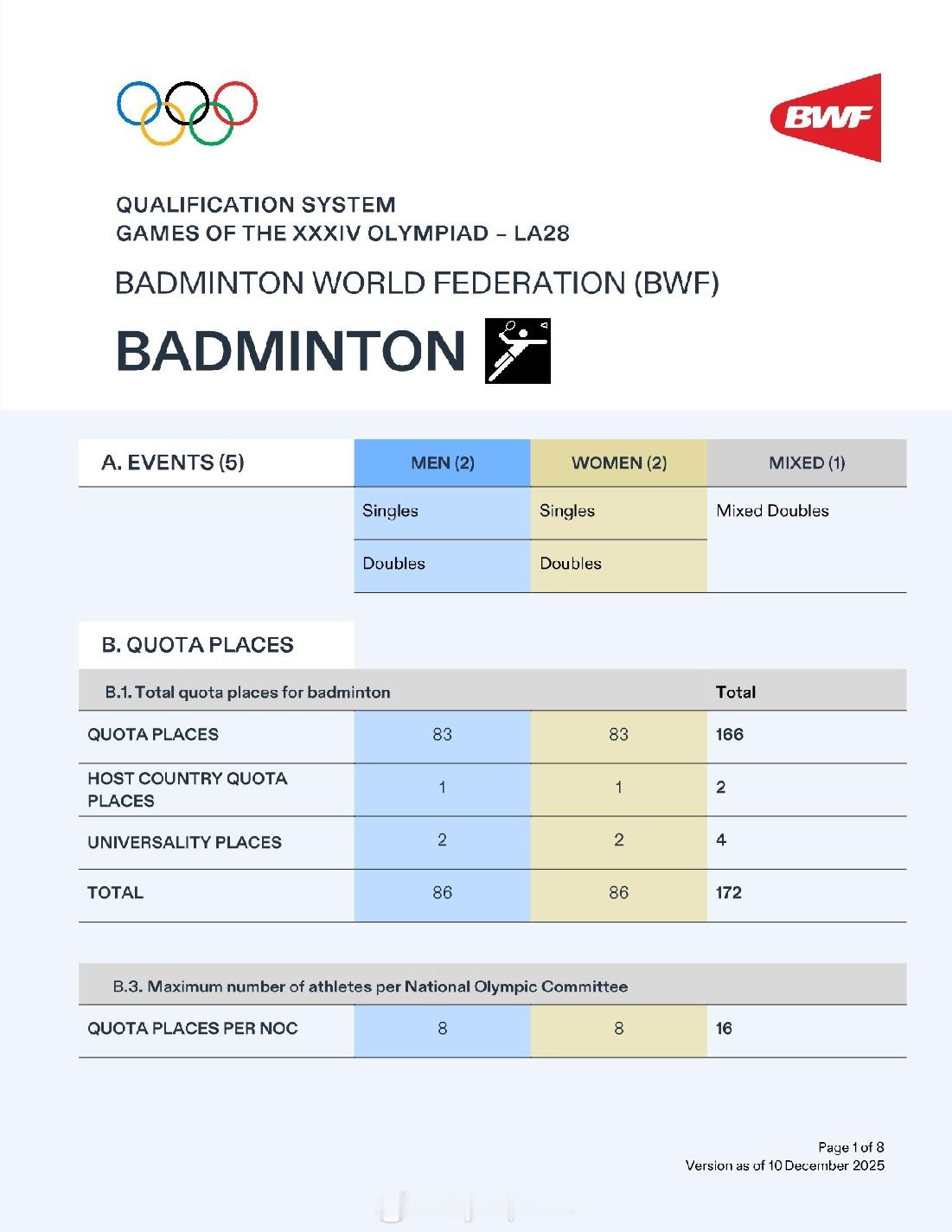 【洛杉矶奥运羽毛球资格获取方案公布】2028年洛杉矶奥运会2025年世界羽联年终总决赛 12月10日,国际奥委会公布了2028年洛杉矶奥运会首批28个分项的资格获取方案。羽毛球方案与巴黎奥运相比没有大的变化:依据截至2028年5月2日的世界排名:1、单打世界排名TOP16有两名及以上球员的协会可以获得最多两个席位,否则按世界排名取1人2、双打世界排名TOP8有两对及以上球员的协会可以获得最多两个席位,否则按世界排名取1对3、拥有超过两名(两对)有资格球员的协会可以决定最终席位的归属