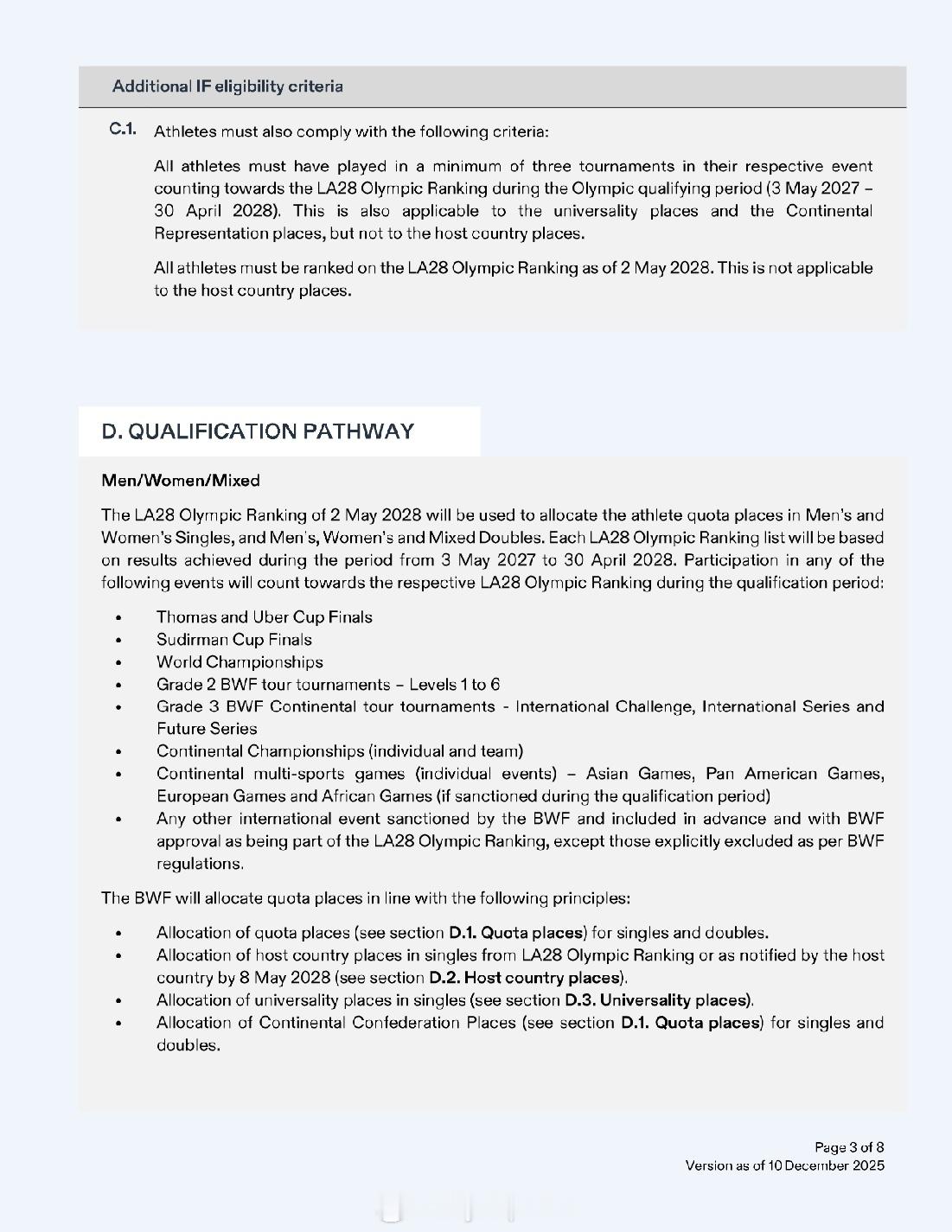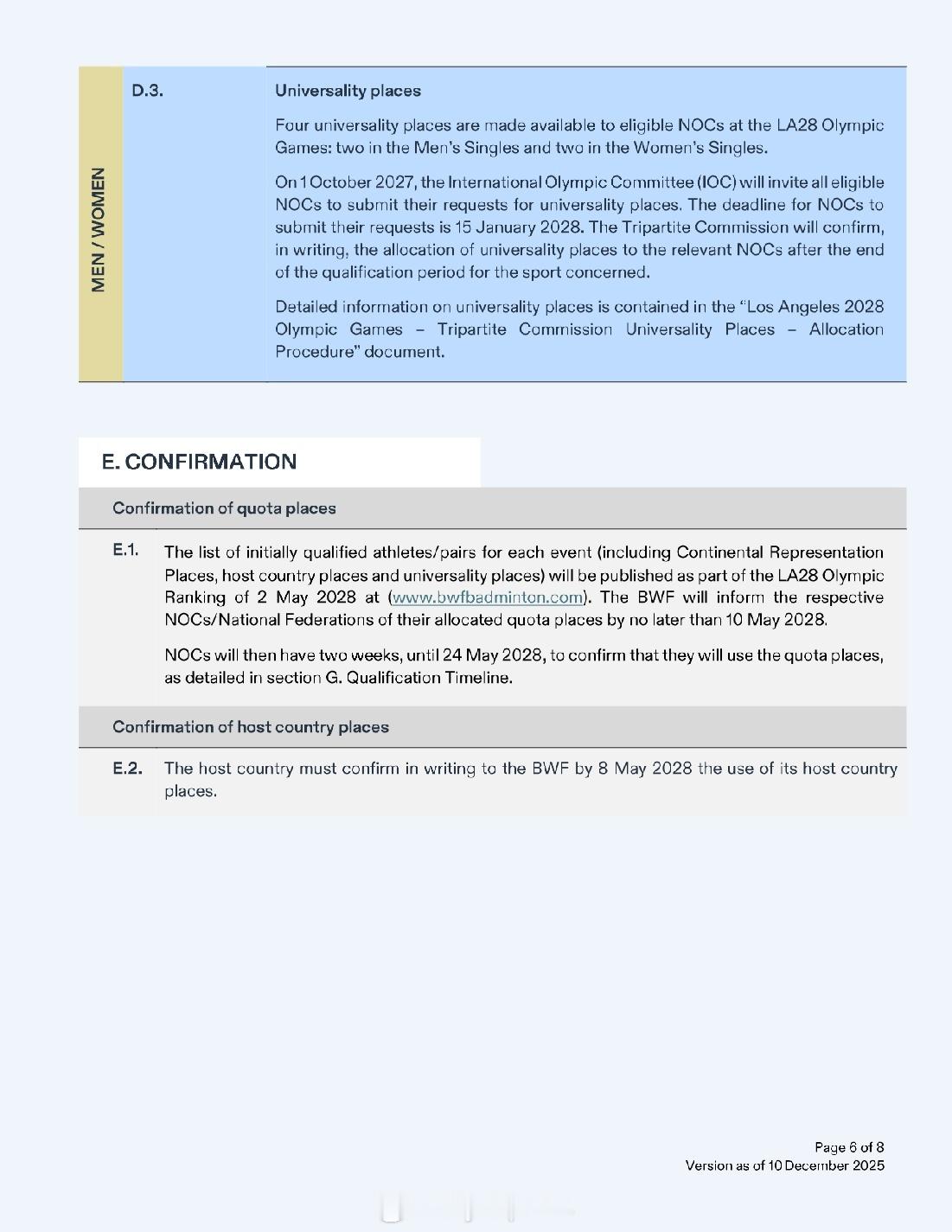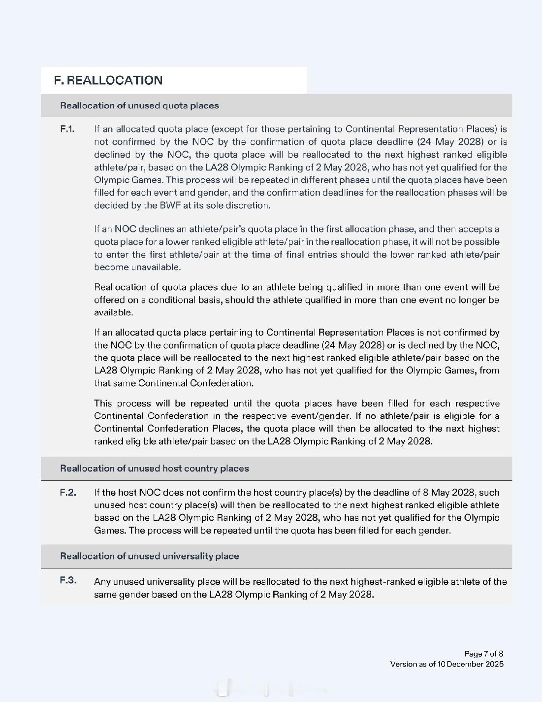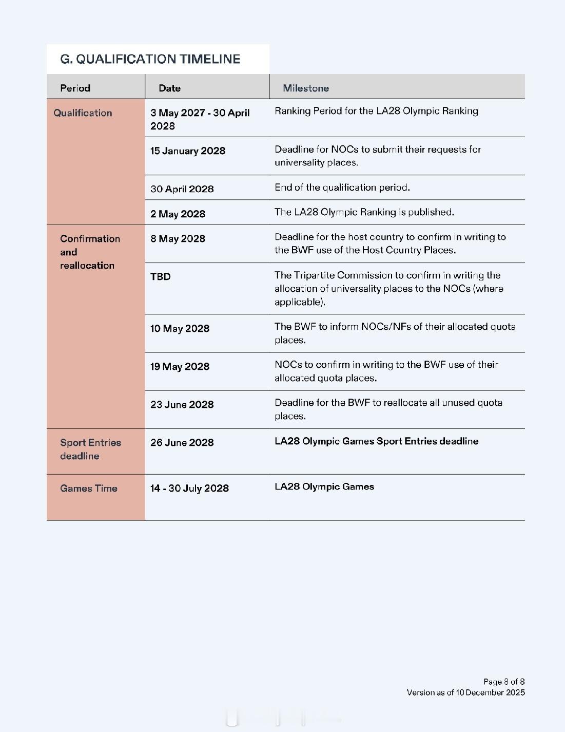 【洛杉矶奥运羽毛球资格获取方案公布】2028年洛杉矶奥运会2025年世界羽联年终总决赛 12月10日,国际奥委会公布了2028年洛杉矶奥运会首批28个分项的资格获取方案。羽毛球方案与巴黎奥运相比没有大的变化:依据截至2028年5月2日的世界排名:1、单打世界排名TOP16有两名及以上球员的协会可以获得最多两个席位,否则按世界排名取1人2、双打世界排名TOP8有两对及以上球员的协会可以获得最多两个席位,否则按世界排名取1对3、拥有超过两名(两对)有资格球员的协会可以决定最终席位的归属