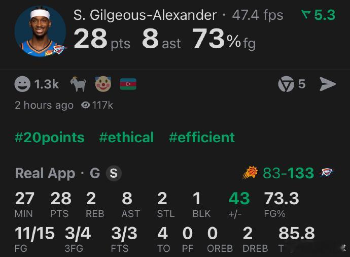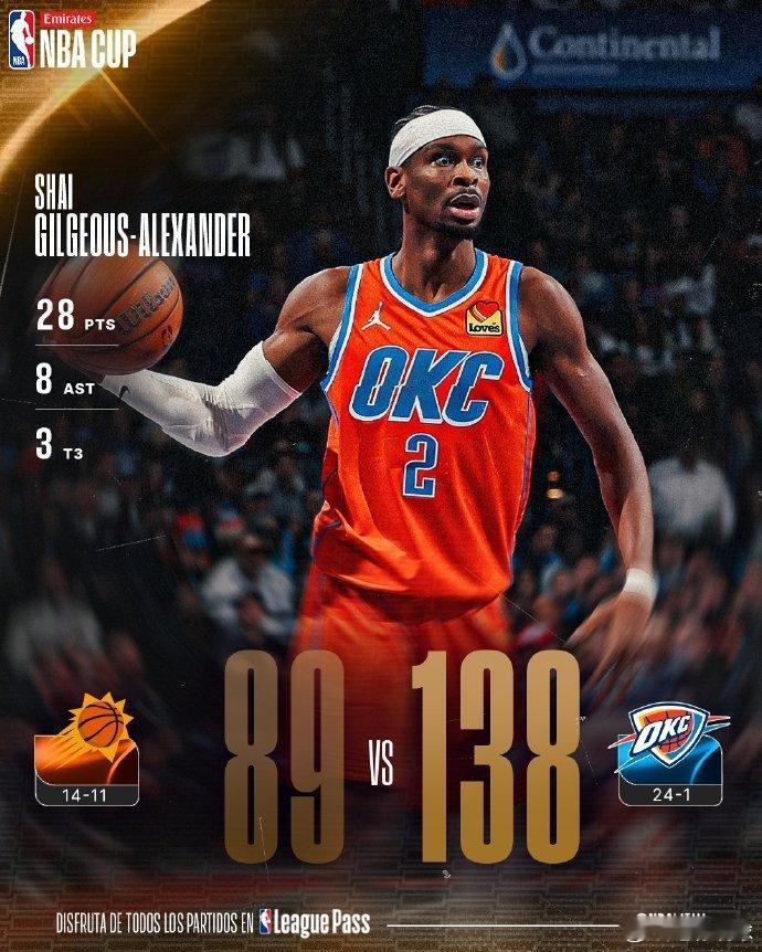 雷霆晋级NBA杯半决赛亚历山大提前打卡下班的神开拓者爆冷雷霆的含金量还在上升 雷霆也太吓人了雷霆138-89大胜太阳!!比赛第二节就失去悬念了,半场雷霆领先26分,最多的时候一度领先53分…本场过后,雷霆战绩24胜1负,追平16勇士的NBA历史最佳开局,这赛季的雷霆真的太恐怖了!亚历山大本场出战27分钟,投篮15中11,其中三分4中3,砍下28分8助攻2篮板2抢断1盖帽,正负值+43,Ts85.8%!