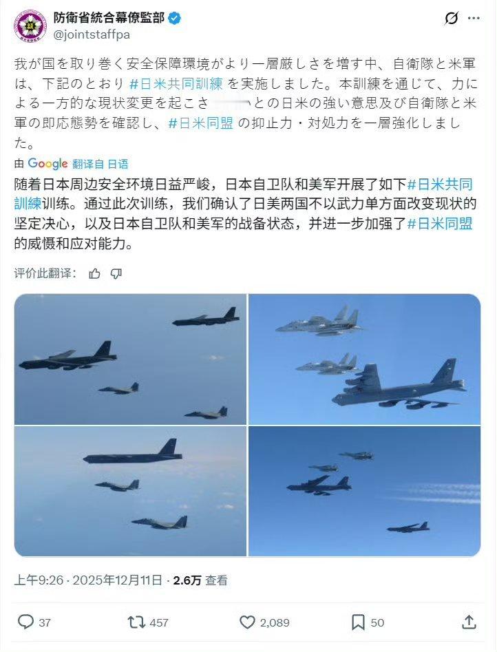 今天美日也搞了个联合巡航美国出动了B-52轰炸机,日本自卫队F-15J为其护航。太平洋空军司令部和日本防卫省同时发帖宣布了这次巡航。 烽火问鼎计划 热点观点 日本自卫队滋扰辽宁舰编队训练