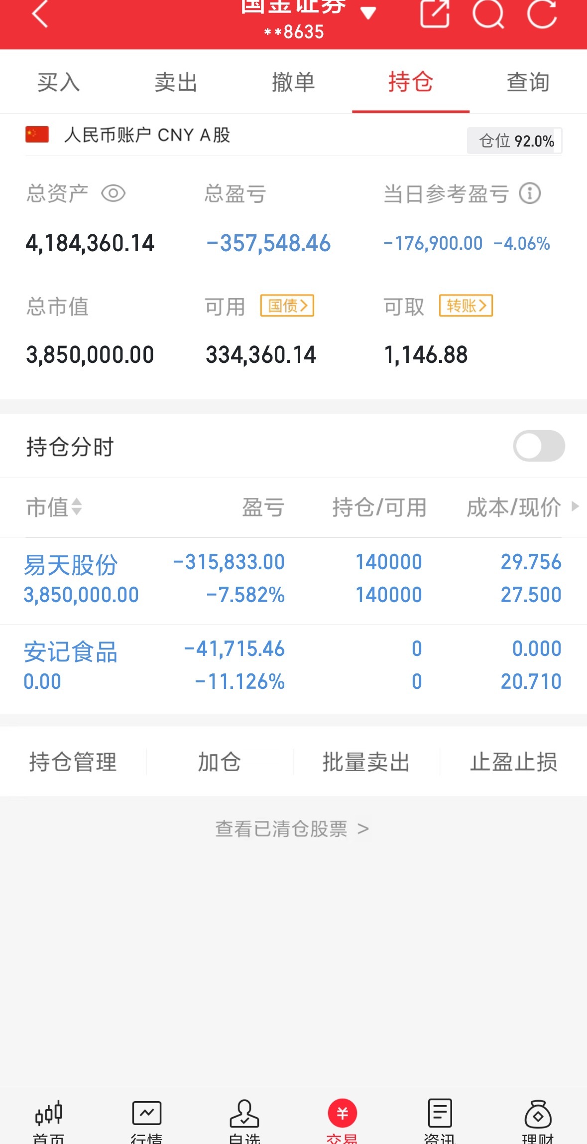 200w本金,目标1年做到1000w,1年翻五倍,欢迎各位关注验证!(第108天)今天买入:今天卖出:安记食品继续持有:易天股份今天怎么跌下去的,明天就会怎么涨上来!隔夜外围降息落地,美股三大指数都是上涨,今天早盘的亚太市场基本上纷纷高开,可惜随后市场就跳水了。今天大A高开低走,昨天我们的走的长下影线的深V,预期情绪反弹,结果今天指数早盘只在部分板块回流之后,一路走低变成了这个模样。感谢大家的支持与互动,点赞富一生,评论666股市一路长虹特别声明:这只是我个人的操作记录,不作为任何投资建议,更不是劝你们跟买! 股市有风险,投资需谨慎!股票投资今日股市