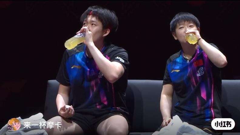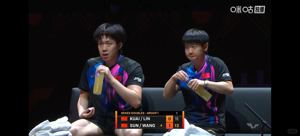 莎莎喝水的时候在憋笑了。 今天的混双是王楚钦/孙颖莎对林诗栋/蒯曼,一上场的时候,林诗栋和王楚钦一对视就笑了。他们比赛打的也很胶着,但是看着是比较轻松的氛围,前两局王楚钦孙颖莎是都赢了。在比赛的局间,俩人就在喝水,时间一到起身去打比赛,他俩真的局间休息就是纯休息,一点不沟通,俩人坐那笑死我了。 这俩喝水也很有默契啊,莎莎喝水的时候都在憋笑,估计昨天采访的时候王楚钦说赛程密集会多交流,今天都不用交流了,就是靠默契啊,看他们打比赛,配合的是真好,莎莎反应特别快。到了第三局比赛,王楚钦孙颖莎是10-5拿到了赛点,然后裁判都报分了,大家都以为11-5赢了,结果裁判说比分错了,刚刚有个擦边,又把比分改成了10:6,在等待的时候看到楚钦和莎莎笑了,他俩现在真的长得是越来越像了。最终莎头组合是3-0赢了栋曼组合,取得小组赛两连胜。今天王楚钦的状态看起来好很多了,这场比赛结束后,蒯曼一会儿还有女单的比赛,莎莎晚间也有女单的比赛,两个人都加油。