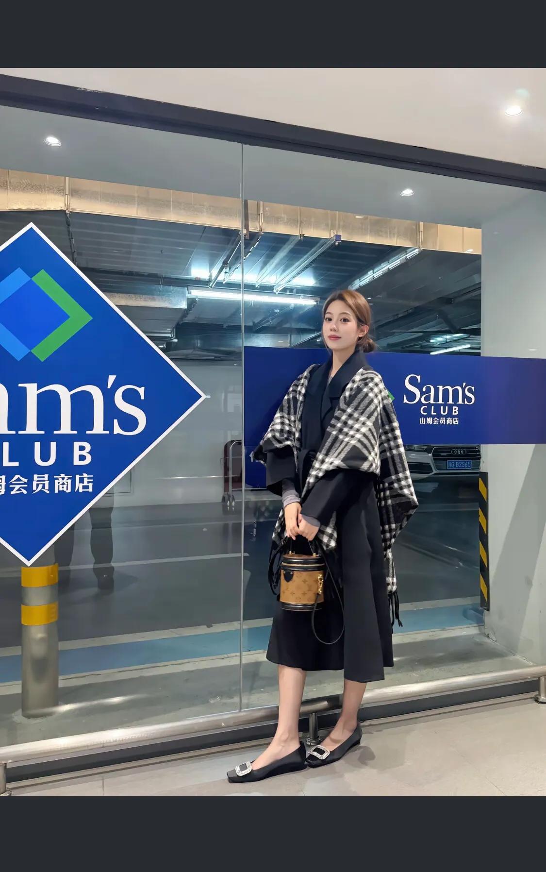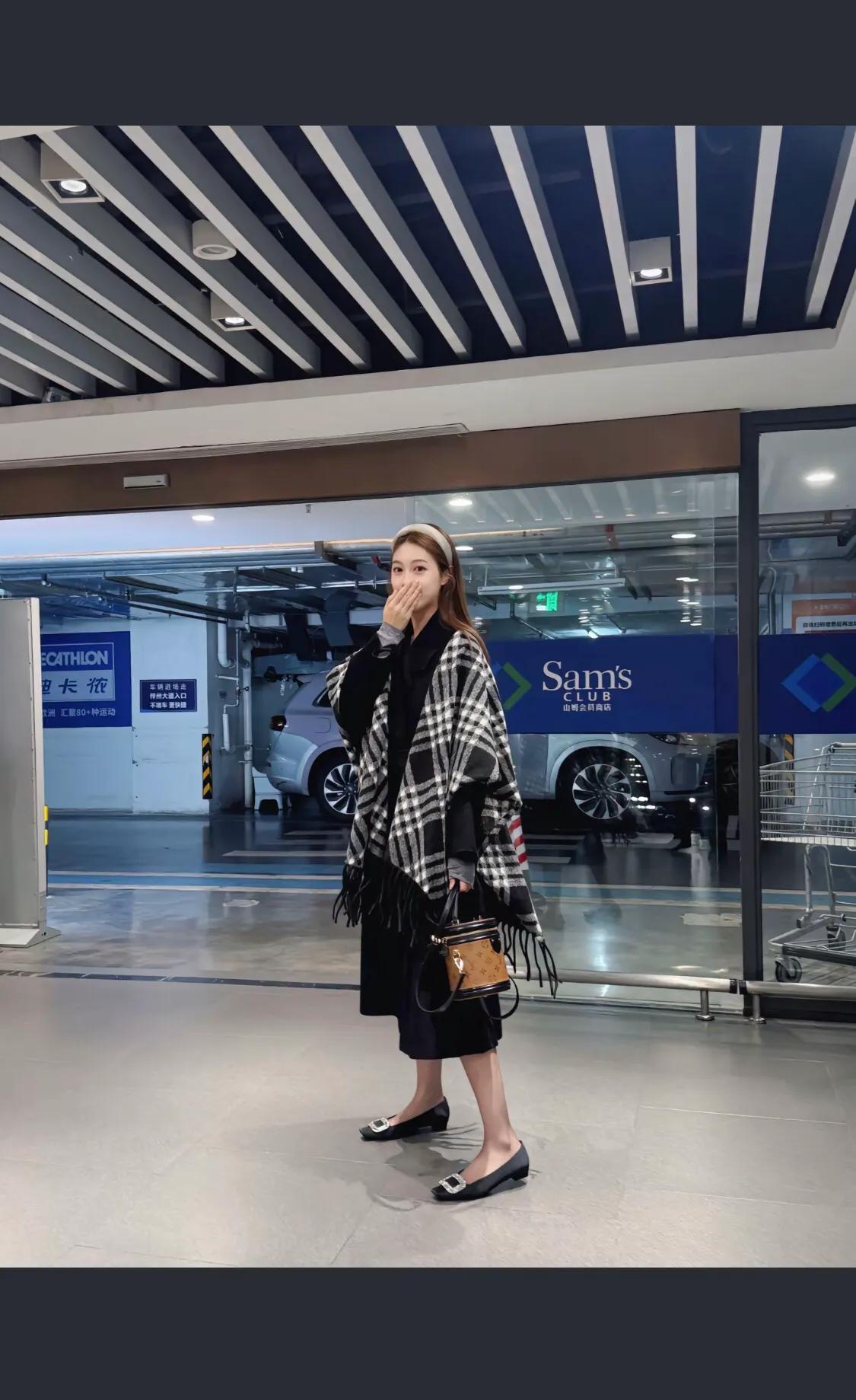 黑白格纹披肩搭配黑色连衣裙,优雅又时尚,完美演绎都市女性风范!