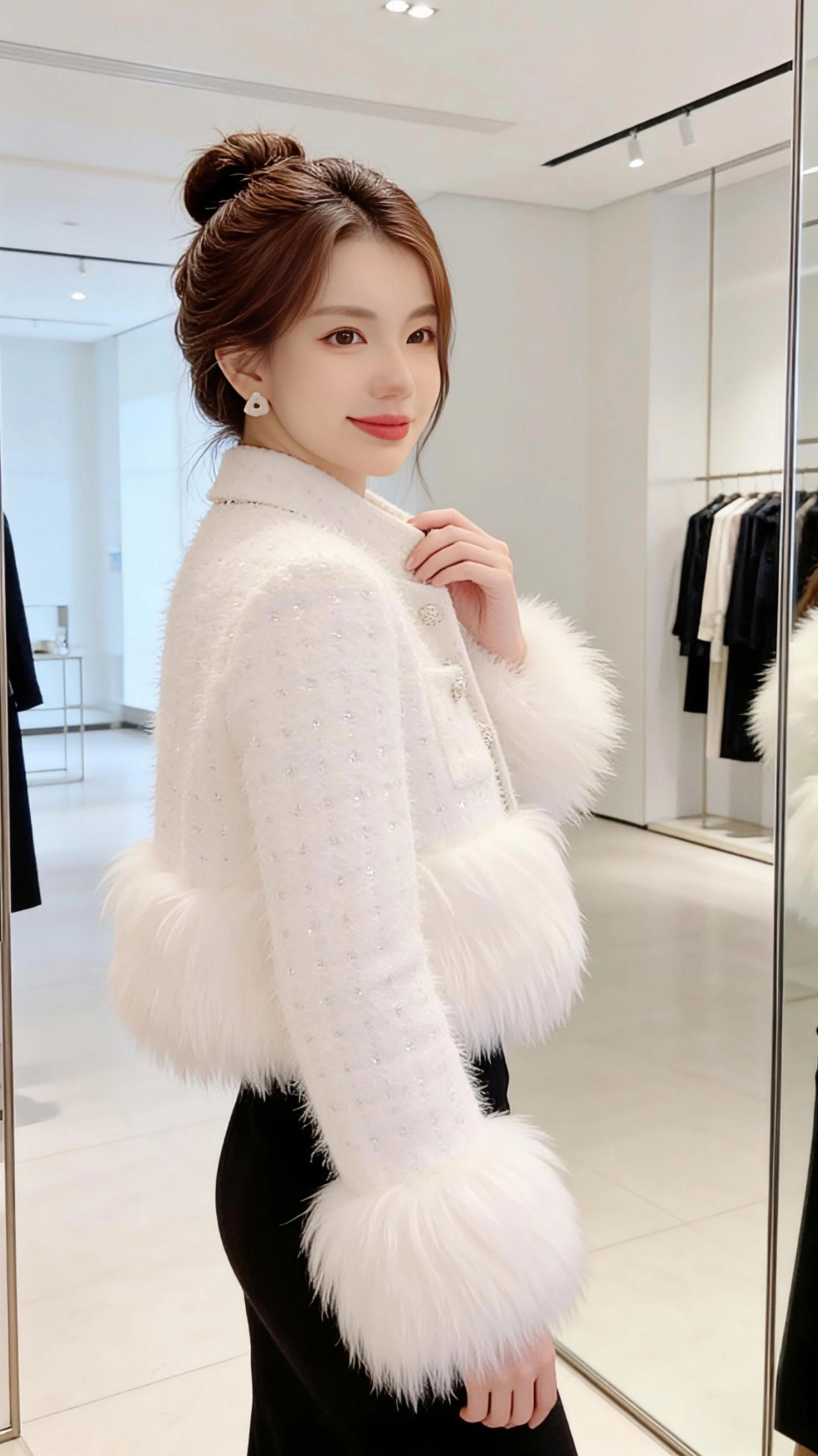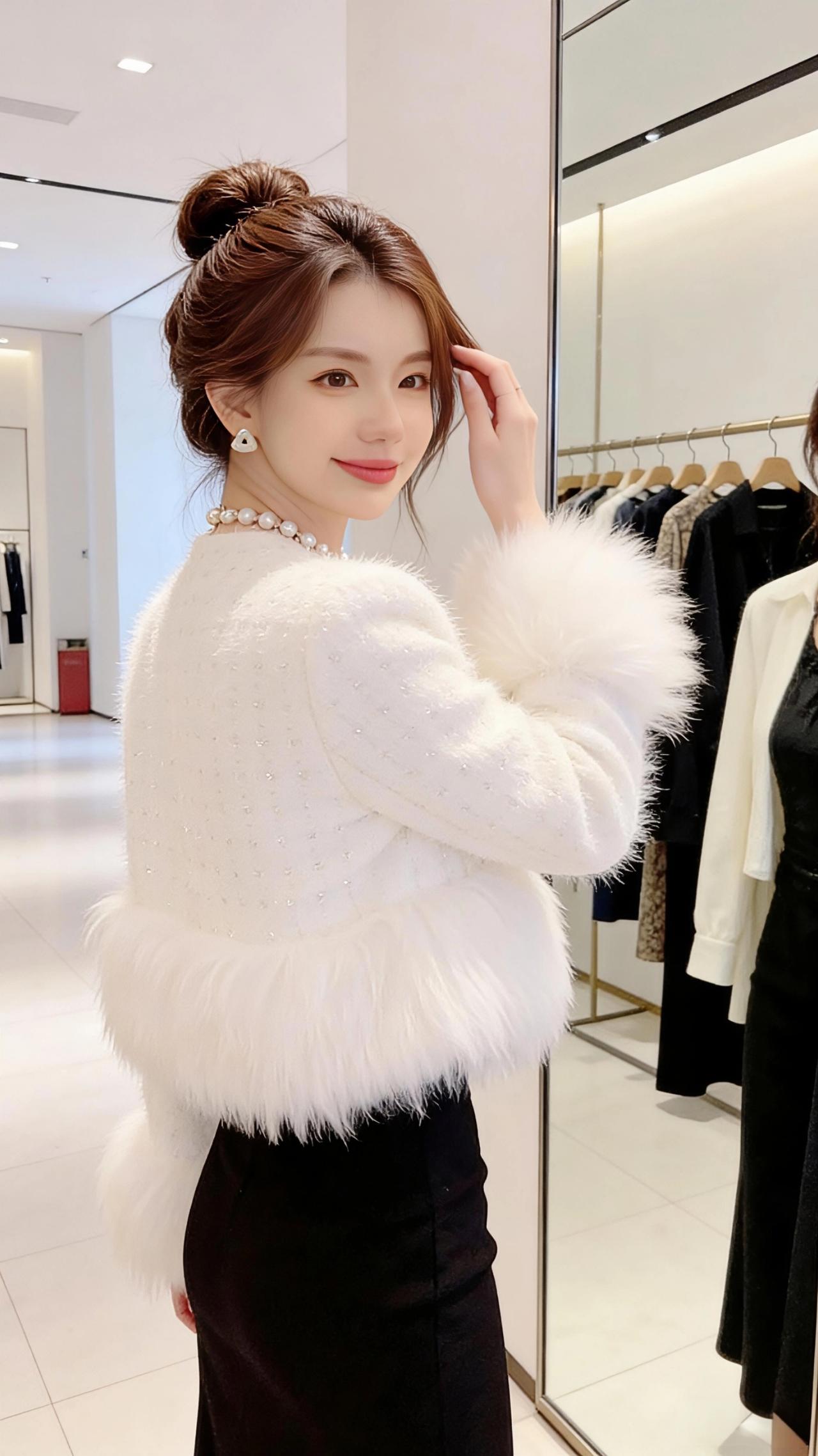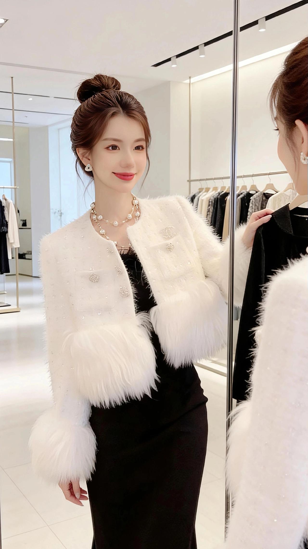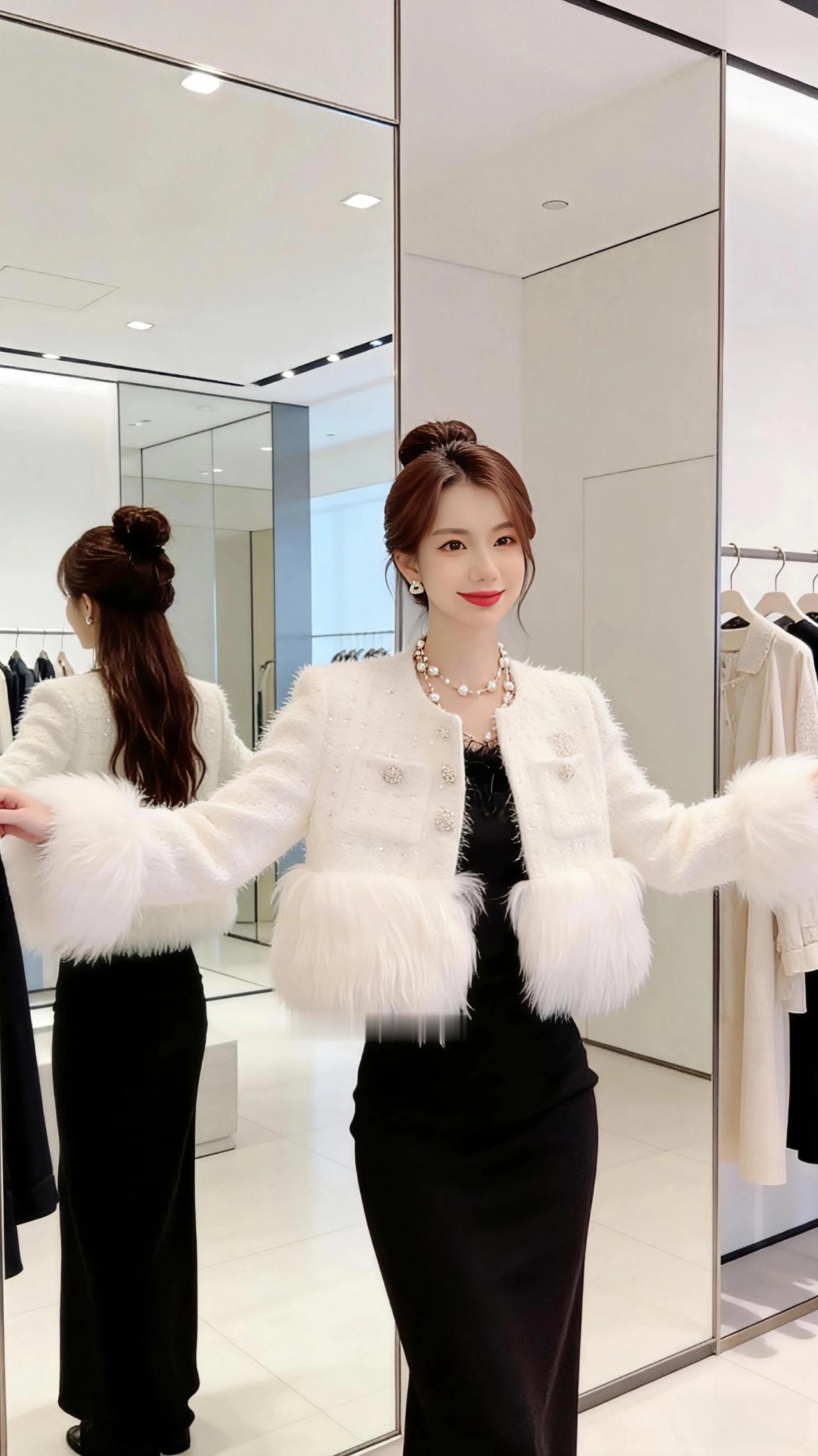 镜前白衫 试衣间的镜面切割出光的棱角,暖白的灯光淌在白色短款外套的绒毛上,碎钻似的细闪揉进蓬松的毛边里,像把冬日的初雪揉成了温柔的褶皱。 黑发挽成蓬松的丸子头,几缕碎发垂在颊边,抬手时,袖口的毛茸随动作轻晃,与镜中映出的身影相叠。黑裙的柔滑衬得白衫更显清透,珍珠项链的光泽绕着颈间,似掬了一捧月光缀在锁骨处。 指尖轻触镜面,冷凉的玻璃映出笑意,衣摆的毛边拂过腰线,像云朵擦过晴空。试衣间的喧嚣被隔绝在外,只有镜与衣,人与影,在这一方小小的空间里,妥帖盛着一份精致的温柔。 高级感穿搭 小个子穿搭