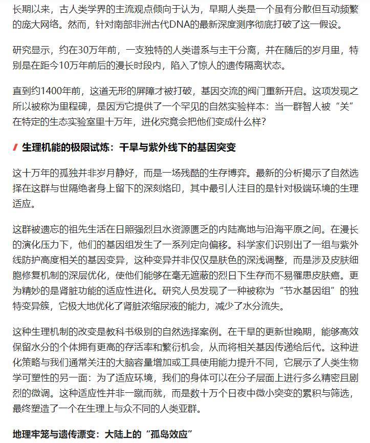 与世隔绝 10 万年!科伊桑人祖先基因变异,改写人类进化史 原文来自:人工智能学家《进化史的里程碑,人类与世隔绝10万年,专家们终于发现基因变异》