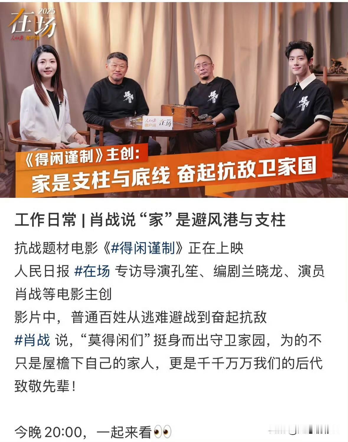 《得闲谨制》主创导演孔笙,编剧兰晓龙,主演肖战,今晚8:00做客人民日报直播间畅聊作品主题@《家是支柱和底线,奋起抗敌卫家国》肖战得闲谨制