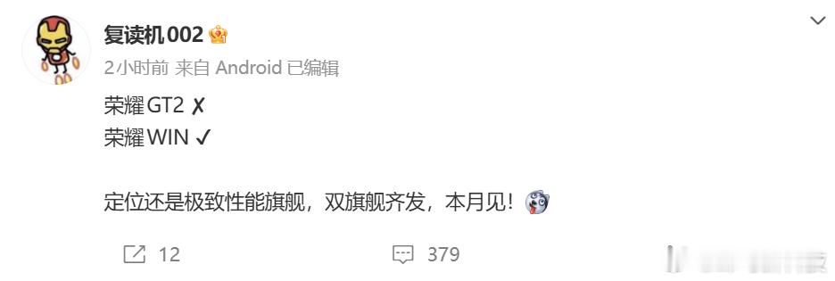【荣耀GT2系列改名荣耀WIN】博主数码闲聊站今天发文透露,荣耀GT2系列将改名为“荣耀WIN”,定位极致性能旗舰,预计本月发布。与此同时,一张京东商城的商品详情页截图流出,显示为“超神性能双旗舰”。系列预计包含荣耀WIN和荣耀WIN Pro两款,其中Pro版将搭载骁龙8 Elite Gen5处理器、6.83英寸1.5K直屏,配备不低于8500mAh电池,并拥有5000万像素大底主摄、金属中框、超声波指纹等高规格配置。疑似荣耀将推出WIN新系列