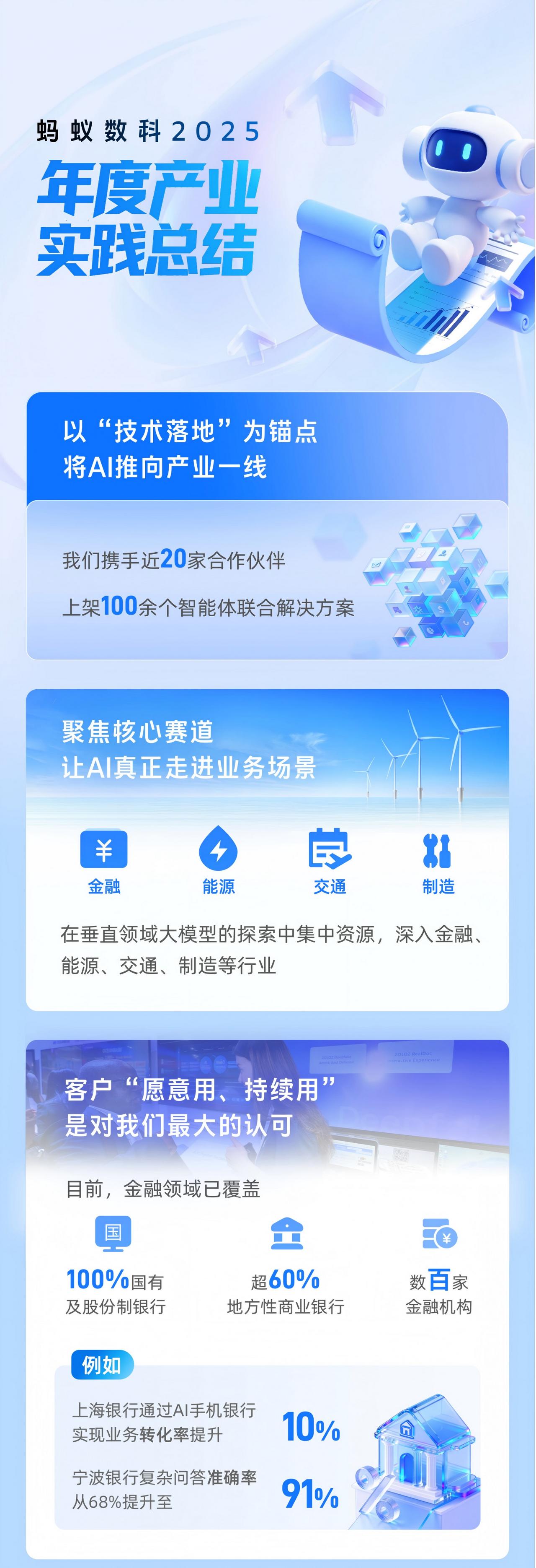 独立运营不到2年,蚂蚁数科彻底把AI业务盘活了! 看了蚂蚁数科生态伙伴大会,尤其是蚂蚁数科甩出的年度成绩单,真的挺意外。没想到蚂蚁已经率先在金融这个公认难啃的领域,完成了AI技术的深度应用和规模化落地。 要知道,产业AI落地本身就很难,金融领域更是如此——数据门槛极高,合规要求极严,容错率极低。 结果呢?过去一年,蚂蚁数科已经和金融、能源等领域的近20家头部伙伴合作,搞出了100多个真正能用的智能体解决方案。目前,其服务已覆盖全部国有股份制银行、超60%的地方性商业银行及数百家金融机构。 换句话来说,在金融领域,蚂蚁数科已经完成通关成就了。 也正因如此,蚂蚁数科下一步的目标很明确:把金融场景验证过的能力,拓展到更广泛的民生百业,深入到每个人的生活场景。 但问题是,各行各业有各自的痛点,单打独斗也很难快速铺开,蚂蚁数科怎么做呢? 在技术层面,蚂蚁数科构建了全栈产品矩阵。中间有金融专属评测基准Finova保障模型效果,底层有太仓标注中心提供数据支撑,再加上天玑实验室的前沿技术探索,形成了从技术研发到场景落地的完整闭环。 在生态方面,蚂蚁数科在大会宣布升级“星澜计划”,面向300家深度合作合作伙伴及,从技术赋能、运营支持、商机共享、资金扶持四个维度全面提升伙伴能力,就是为了推动AI的生态化落地。赵闻飙将其形容为打造一片“开放的黑土地”——蚂蚁数科提供土壤与养分,比如客户资源和服务机会拿出来共享,主打一个有肉大家一起吃。这不妥妥的我负责修桥铺路,伙伴安心在路上跑出节奏、跑出规模吗? 随着产品技术+生态共建的“两步走”的战略推进,蚂蚁数科这次是真的把自己的AI业务盘活了!