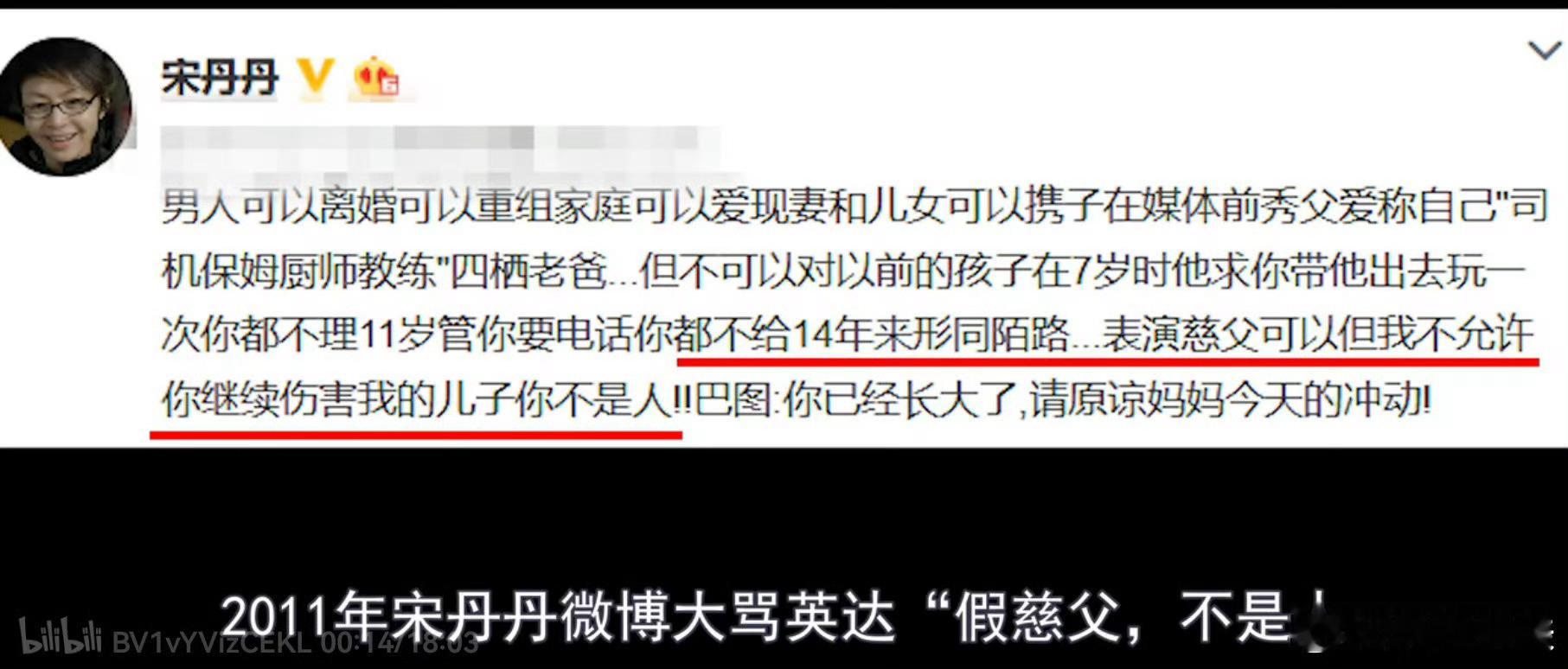 宋丹丹不是个完美的人,也有错的时候(非和英达婚姻)但是宋丹丹骂英达不是人真是全文看看感觉骂得不要太对又没有男的被老婆强健,成龙这种爽了不管私生女的已经很恶,英达这种结婚生子你情我愿,离婚了自觉不爽、对方根本还不是过错方,就不理不管亲生儿子真是禽兽