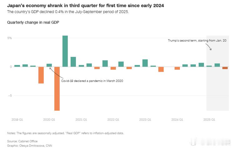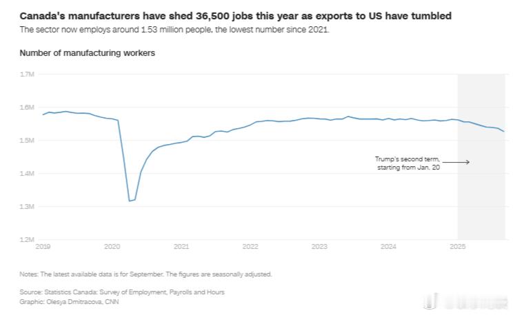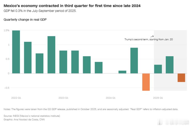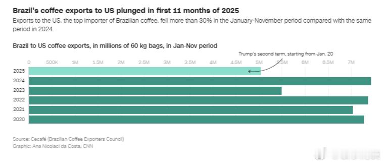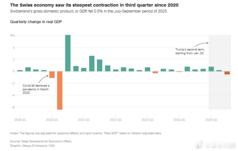【五张图表展示了特朗普关税对全球的影响】(CNN)美国总统唐纳德·特朗普于1月开始其第二个任期后不久,便发动了一场混乱的贸易战,提高了对数十个国家的关税,然后又改变了一些关税,并同意达成一些初步的贸易协议。美国平均进口税目前处于20 世纪 30 年代以来的最高水平,有迹象表明,更高的关税正在导致美国人 面临更高的物价。但它们造成的伤害也波及到美国以外的地区。以下是来自世界各地的一些例子。——瑞士、日本和墨西哥遭受重创瑞士经济在第三季度萎缩幅度为2020年新冠疫情最严重时期以来最大。政府将经济萎缩主要归因于化工和制药行业产量的暴跌,并指出近期与美国新关税相关的外贸波动。图2。亚洲方面,日本经济第三季度也出现萎缩。出口和私人住宅投资下降是主要原因。图3。与美国距离更近的墨西哥经济在第三季度也出现萎缩。经济学家将经济表现不佳的部分原因归咎于特朗普反复无常的贸易政策,该政策打击了商业信心和投资。图4。——加拿大制造商裁减了数千个工作岗位根据官方的就业、工资和工时调查,加拿大制造业自今年年初以来已减少了 36,500 个工作岗位,目前劳动力规模为 2021 年 9 月以来最小,当时该行业仍在遭受疫情的冲击。加拿大制造商和出口商协会(一个行业协会)在9月份表示: “制造业是受美国关税措施打击最严重的行业之一”,并称该行业是出口的关键驱动力。图5。——巴西对主要市场的咖啡出口大幅下降从8月到11月中旬,巴西对美国的咖啡出口被征收高达50%的关税。巴西咖啡出口商协会(Cecafé)主席马尔西奥·费雷拉在10月份 表示,这项关税使得“实际上不可能向该市场出口”。根据该委员会的最新数据 ,今年8月至11月期间,美国从世界最大咖啡生产国巴西的咖啡进口量比去年同期减少了一半以上。这一降幅导致 自2025年初以来,巴西咖啡对美国的销量同比下降了32.2%。图6。尽管有所下降,但在 2025 年前 11 个月,美国仍然是巴西咖啡最大的进口国。巴西农业部告诉 CNN,咖啡生产及相关活动占巴西国内生产总值的 1.8%,咖啡种植业雇佣了该国约 3% 的劳动力,其中包括季节性和间接就业岗位。
