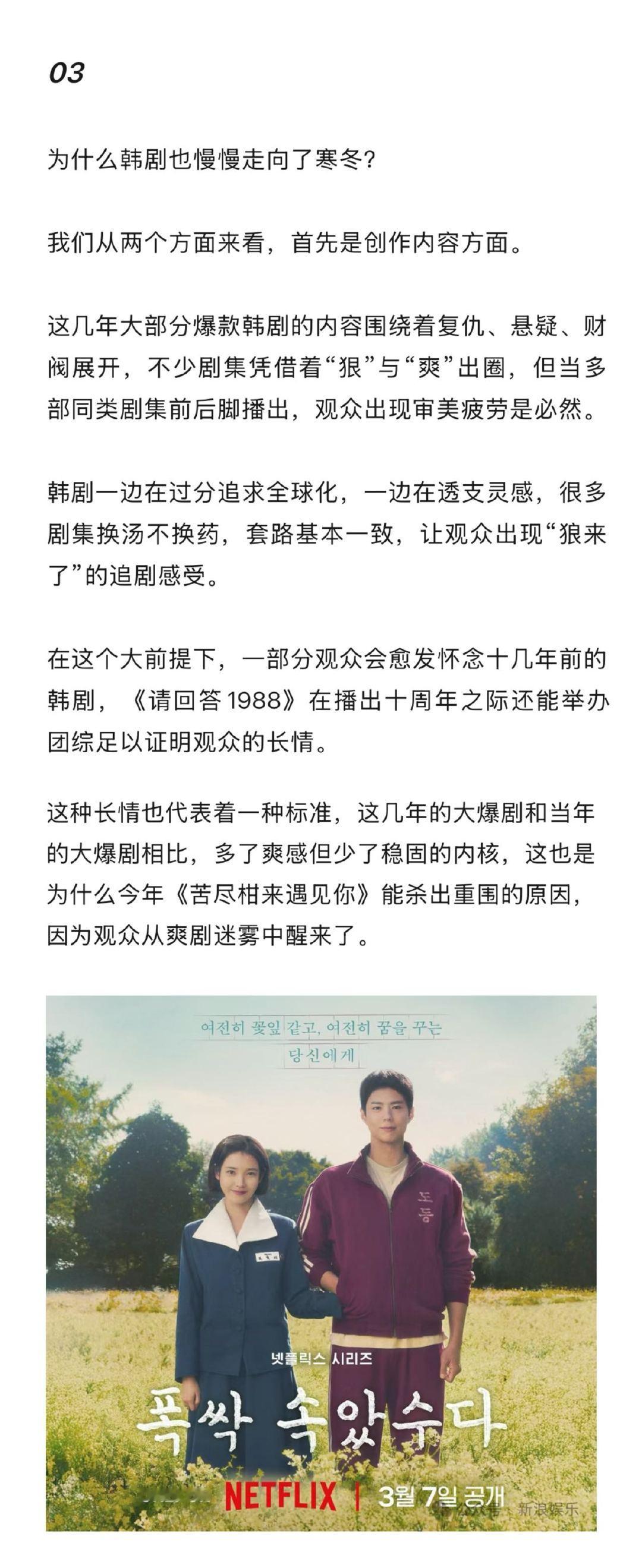 爆款韩剧背后的影视寒冬为什么今年的爆款韩剧变少了 韩剧似乎也迎来了影视寒冬,今年除《苦尽柑来遇见你》再无大爆款出现。同时多部网飞韩剧失灵,观众对复仇爽剧愈发不再买单。