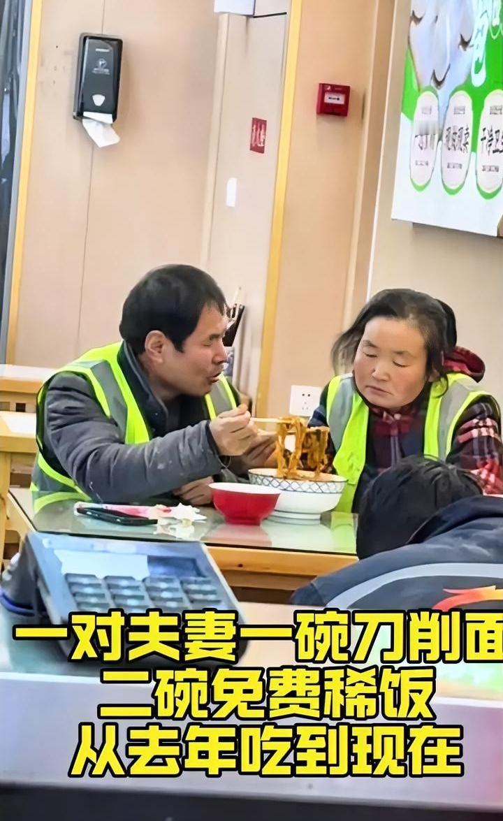 每顿同样的饭,夫妻二人吃了一整年,人活着究竟为了什么? 近期一面馆老板拍下了两位特殊的顾客,这是一对夫妻,看穿着像是环卫工。 老板说他们二人在自家餐馆吃了一年多了,每顿都是一碗刀削面,加两碗免费的稀饭,顿顿都一样,甚至连个咸菜都没有。 不知道大家作何感想?想来他们赚的钱都贴补家用了,也许是孩子的学费,也许是老人的医药费。 他们对自己很苛刻,顿顿吃一样的东西,吃最便宜的东西,不在乎口腹之欲,如此努力之下,却还是穷困潦倒,苦苦的在为生活而挣扎。 一对夫妻、一碗面、两碗稀饭、一整年,这就是人生的意义。