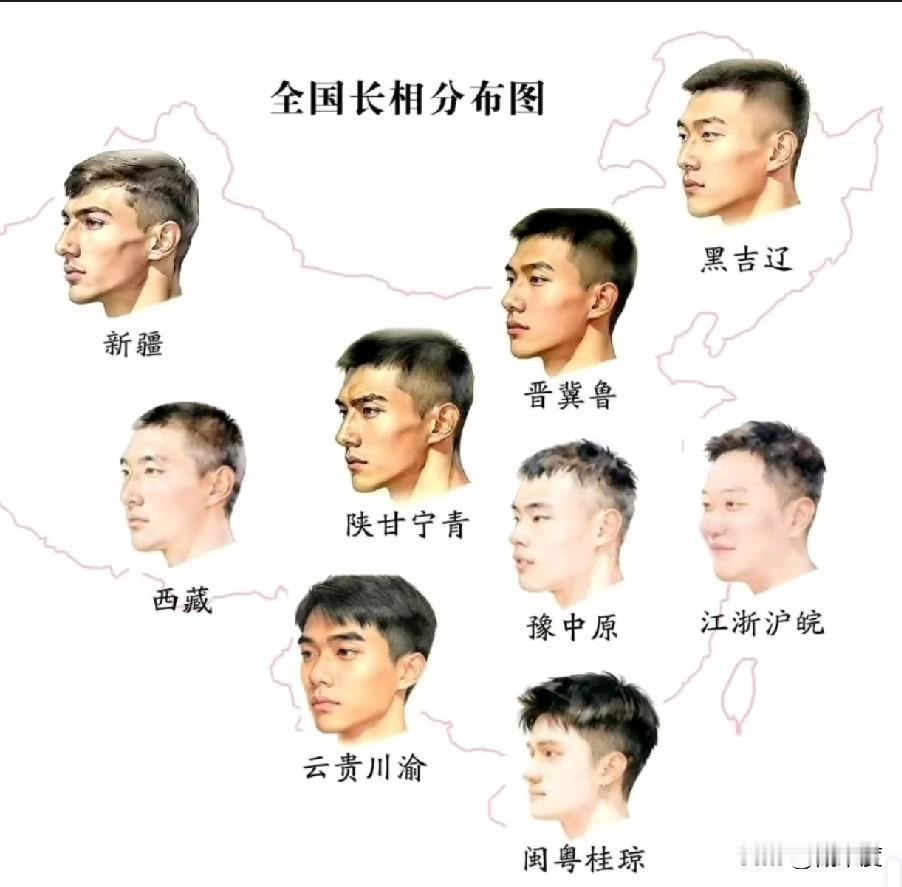全国长相分布图。 陕甘宁青是大部分人的审美吧,陕西,甘肃青海去过了,没发现那边人是这样的长相,这是挑的最帅的来代表的吧,云南的也不是图上的长相,豫、中原,江、浙、沪、皖,闽、粤、桂、琼、倒是有一定的代表性