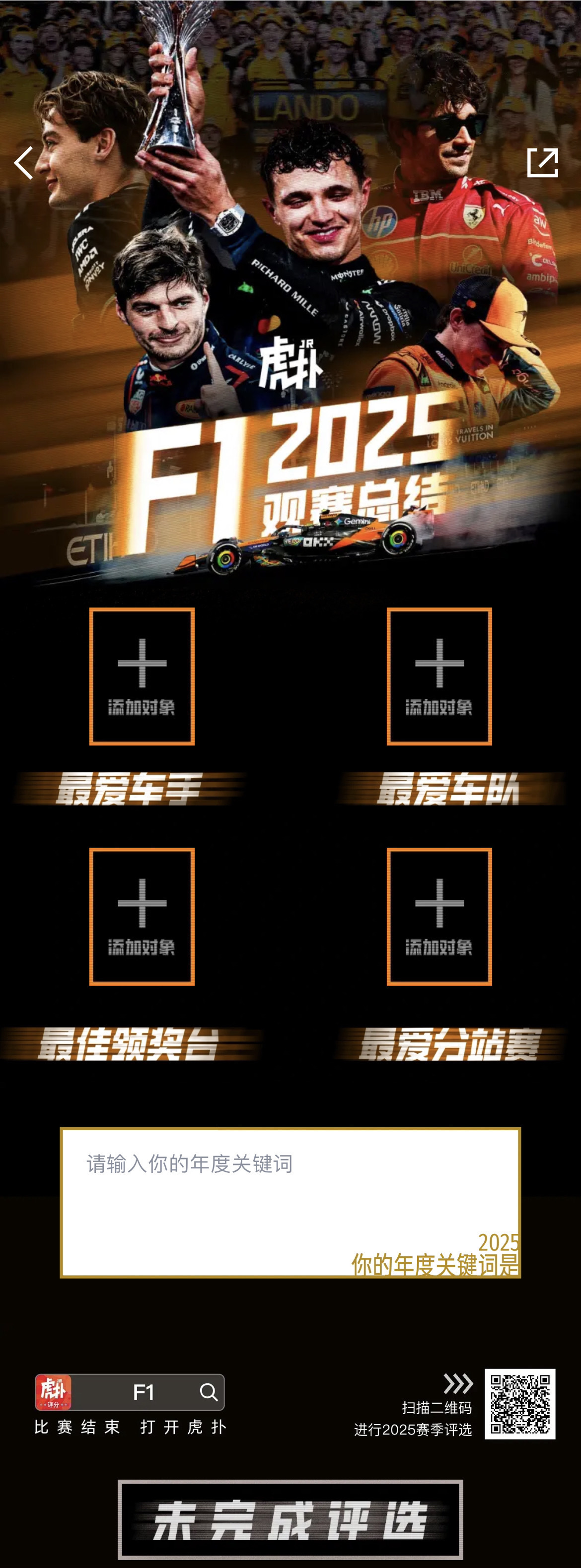 虎扑2025年F1观赛总结,添加你的最爱车手、最爱车队、最佳领奖台、最爱分站赛