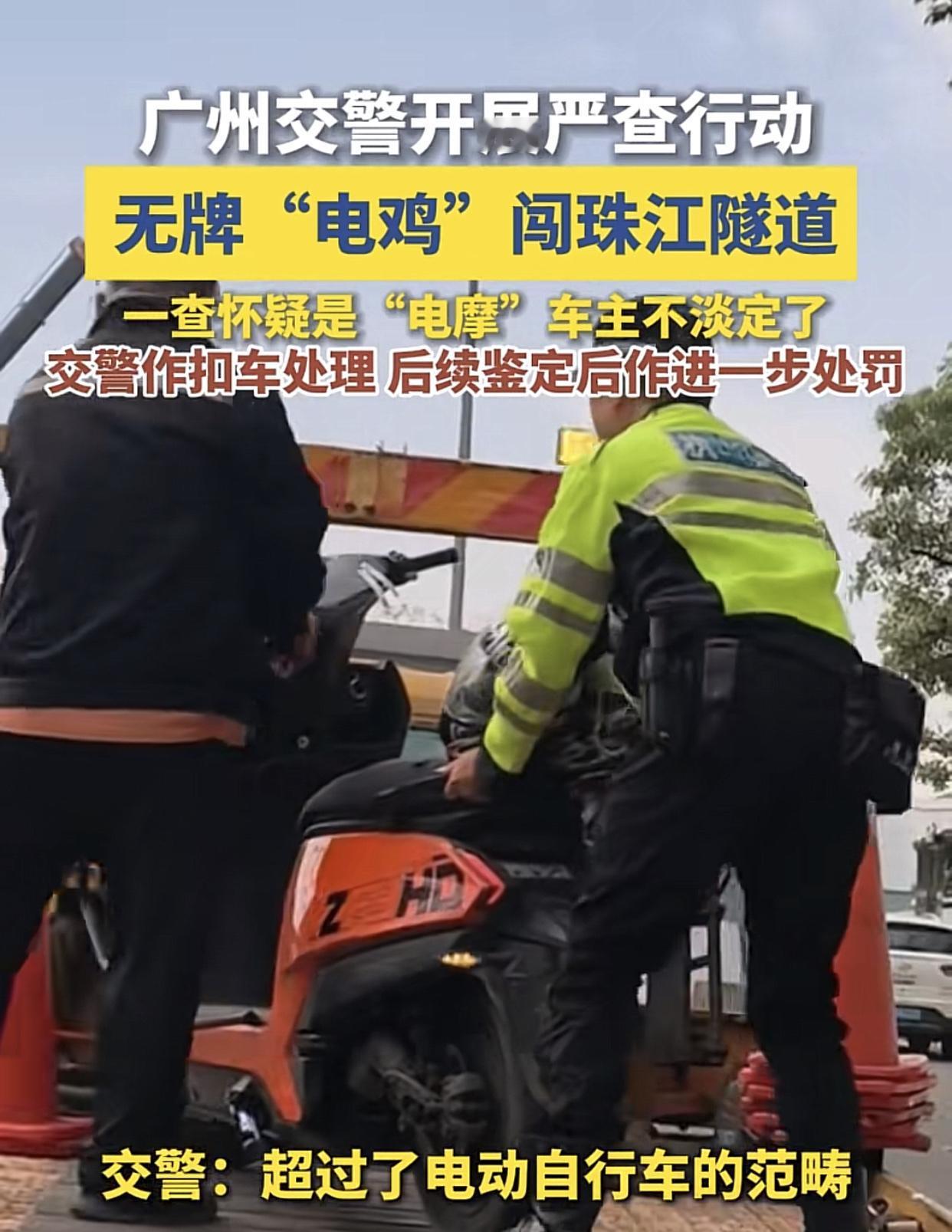 广州珠江隧道出口,交警严查闯隧道无证无照的电摩,电动车电池超过48V400瓦功率的照扣。 这种无照牌没保险没驾驶证的“三无”机动车辆上路,真的要好好去管一下了。以前住的小区就有一家电动车改装店,这个电动车改装店位置比较隐藏,主要改装9号,小牛这二款车居多。我去问过,改装过的车15000元左右,速度猛,续航长,电机,车架,轮毂都必须改装。现在都没人去改,没生意,店主也只能另谋高就了。 看来,广州只能放开摩托车,这样就要考证,好好学才知道上路如何开,处罚就和机动车一样了,电动车才会越来越少。