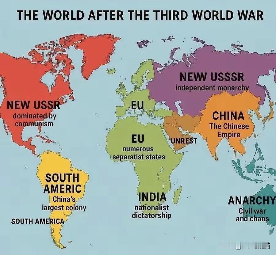 这玩笑太大了! 有国外的网友设想的三战以后的各大势力划分,我敢说中国人看了肯定直摇头。 南亚次大陆包括印度那个点,感觉没有几个国家感兴趣,单单印度这些人口就能把吞并的国家给反噬。 如果东北亚,东南亚纳入版图还是有兴趣的,再一个就是澳大利亚怎么能成为没人要的一块地呢,这个完全可以并入进来。