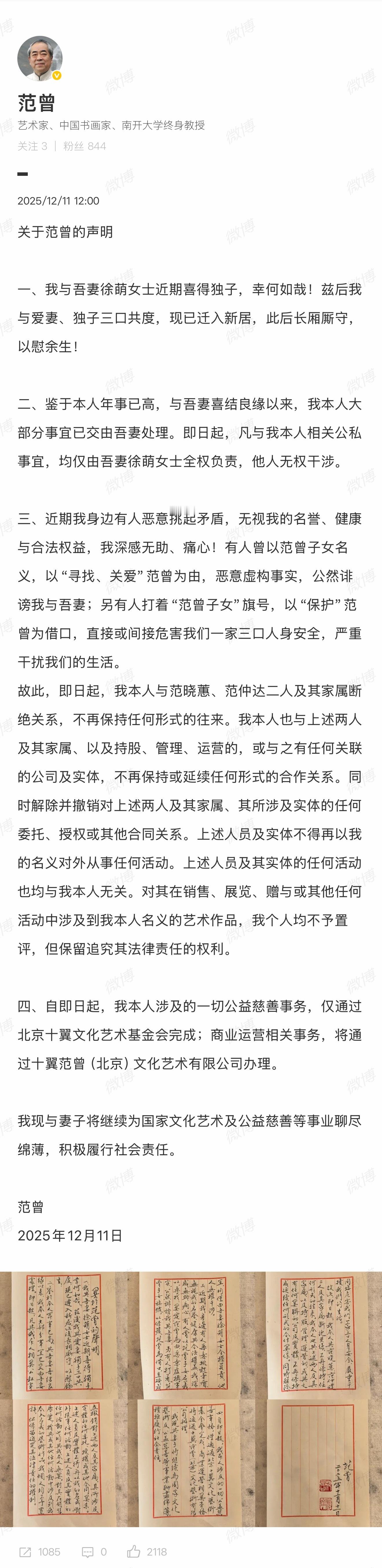 范曾 徐萌范曾宣布与女儿继子断绝关系87岁画家范曾喜获独子 87岁还能生孩子,估计大概率是试管婴儿。不过艺术家老来得子也不罕见。罕见的是为了年轻妻子和儿子,和其它子女断绝关系。另外,通过微博发布文字声明不一定属实,估计两个子女还会继续争下去。老张杂谈