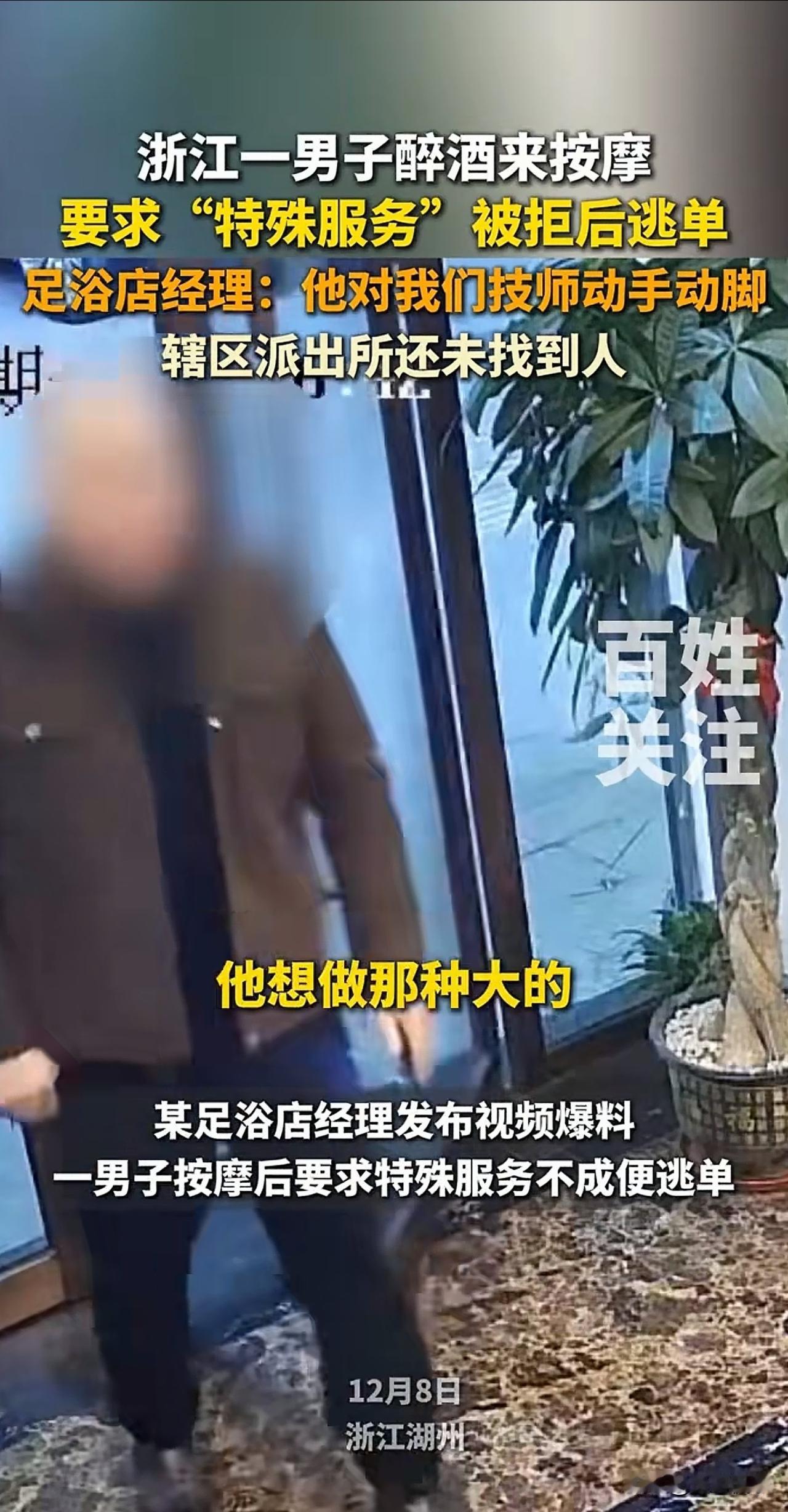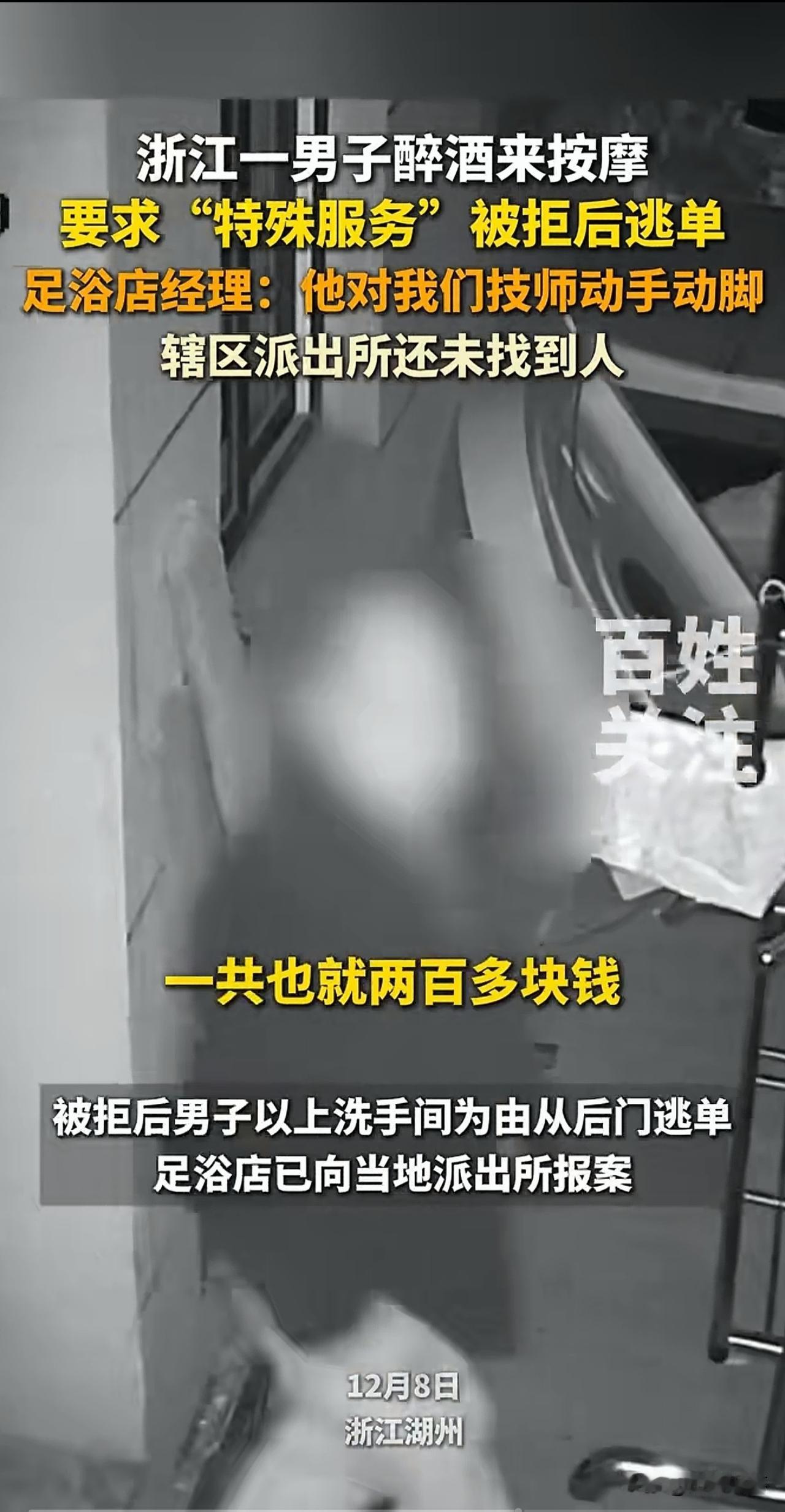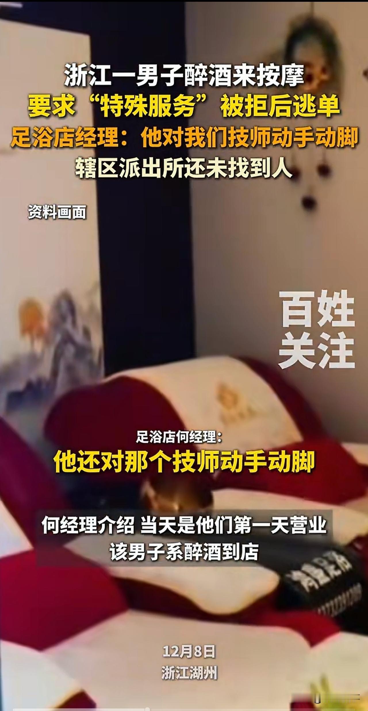 “真是活不起了!”浙江湖州,一男子醉酒后来到按摩店按摩时,要求女技师提供特殊服务不成,还对女技师“动手动脚!”更让人无语的是,男子在接受完服务后,在未付200元服务费的情况下,竟直接溜之大吉。 据当事人何经理表示,12月8日是他们门店开业的第一天。 可谁曾想,第一天店里就来了个"烫手山芋"! 当天,一男子晃晃悠悠走进店中,浑身酒气熏天,一看就是喝多了。 男子进入店中后要求按摩服务,店里安排了一名女技师上前为其按摩。 女技师认真忙活了半天,以为服务结束就能顺利结账,万万没想到,男子突然冒出一句:"有没有特殊服务?" 女技师当场就愣了,赶紧解释店里只有正规的按脚和按摩,没有其他服务。" 可醉酒男子根本不听劝,借着酒劲对技师动手动脚,拉拉扯扯的,把技师气得浑身发抖。 更可气的是,消费总共才200多块钱,男子见没"特殊服务",竟然以上洗手间为由,偷偷从后门溜了,直接逃单! 好好的开业第一天,遇上这种糟心事,何经理又气又无奈,只能赶紧报警求助,目前案件还在进一步侦办中。 对此,广大网友也纷纷替店家鸣不平:“喝了点酒就飘了?还想要特殊服务?动手动脚的,这已经不是耍无赖,是骚扰了吧!” “两百多块钱都逃单,这男的是穷疯了还是脸皮太厚了?真当店家是软柿子好捏?” 1. 喝醉了酒不代表就能为所欲为! 法律里可没"醉酒免责"这一说法,简单来说,喝醉了犯事,该担的责任一点都不能少。 根据《治安管理处罚法》44条规定,男子对女技师动手动脚的行为,已经涉嫌骚扰猥亵他人,轻则可能被罚款、拘留,要是情节严重,还可能触犯刑法 ,依法承担刑责。 此外,男子在接受服务后而逃单的行为,则属于典型的违约,足疗店有权要求其支付两百多元的消费费用。 2. 正规店家有权拒绝"特殊服务"! 有些打着"特殊服务"旗号的按摩本身就违法,正规足疗店应坚守底线,因为只有这样,才能行稳致远。 反过来,那些提供"特殊服务"牟取非法利益者,必然要受到打击,最终得不偿失 。 3. 逃单不是小事,它更体现一个人的诚信底色和规则意识。 试想,如果此事经曝光后,被男子的亲朋好友知道,其颜面尽失是必然的结局。 家人会觉得丢脸,朋友会渐渐疏远,就连共事的伙伴也会暗自提防——一个连两百多块消费都要逃单、对服务人员毫无尊重的人,又怎能让人信任呢? 对此,你怎么看?欢迎大家在评论区留言。