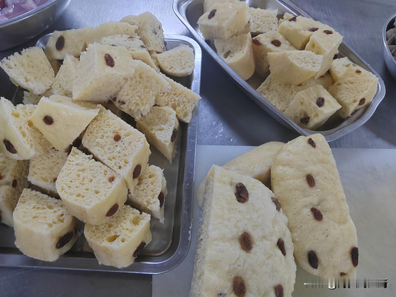 今天的茶点做了发糕,有位哥们笑着对我说,大厨,你给我们做馒头吃得了! 我说,行了吧,伙食费都吃超标了,还讲究啥啊!估计下个月馒头也吃不上了,我感觉下个月吃的比这个月吃的还要多! 日本的伙食贵的要命,每天每个人9美元的伙食费,光喝茶就要消耗掉了1美元(上午10点—10:30分,下午3点—3:30分为喝茶时间,我给做点甜品,还要从库房拿四个果汁)早餐,晚餐,午餐还有水果和牛奶,这都是日本的伙食啊! 我做的发糕,用牛奶和面,加的鸡蛋,奶粉,白糖和葡萄干,蓬松宣软,好吃的很,在家里像我们这种家庭,馒头都不舍得买,都是自己买面粉自己做馒头吃的,再说了,茶点每天都得变着花样做,我也不是糕点师,船上啥情况了,要什么没什么的,这就不错了,知足吧,咱公司别的船上可没有这个待遇的! 这哥们听了后无语了,我今天说话是不是有点过了啊! (今天的晚餐土豆炖肉,炒鱿鱼,辣炒包菜,包菜炒少了,我和大台就没吃)
