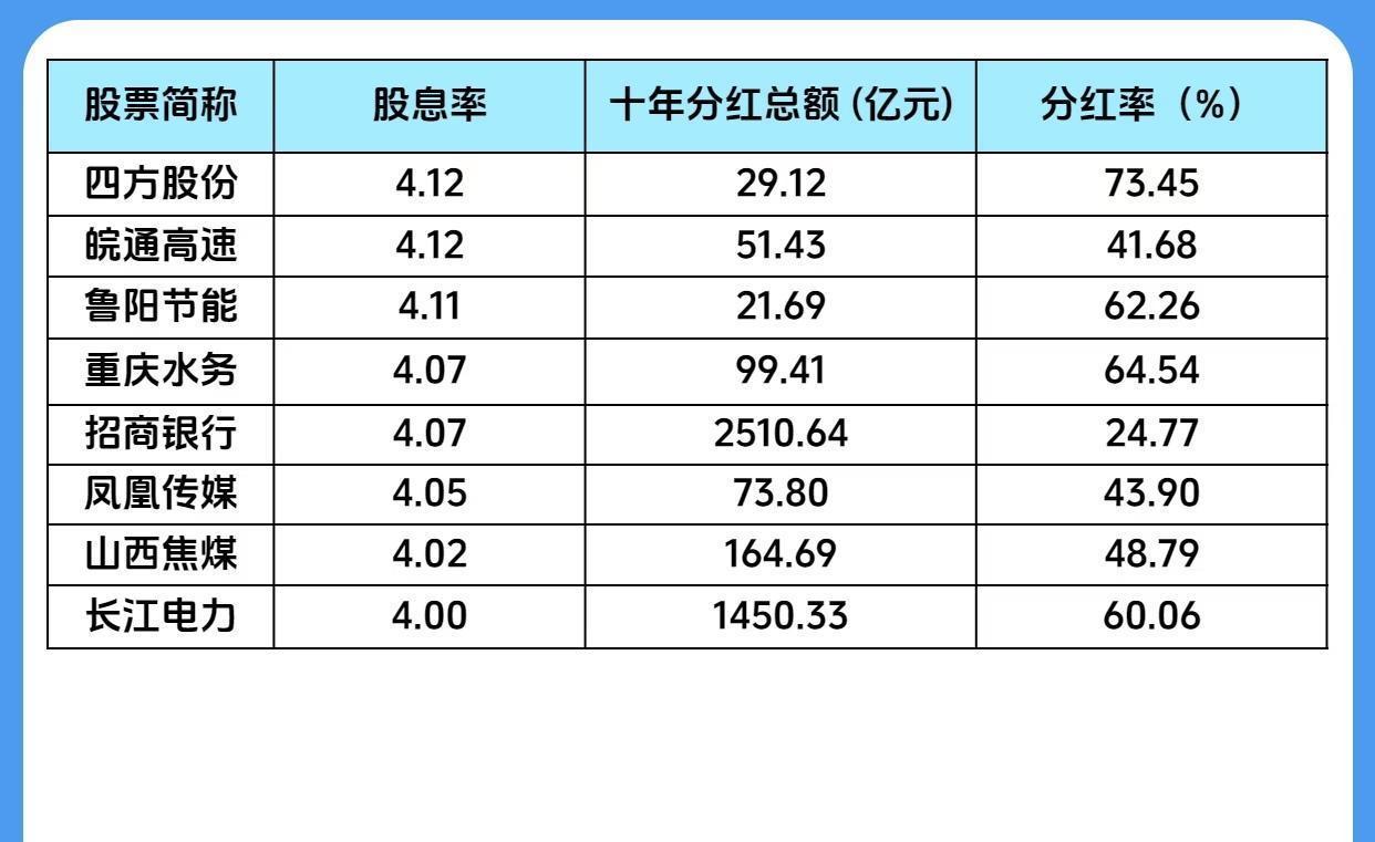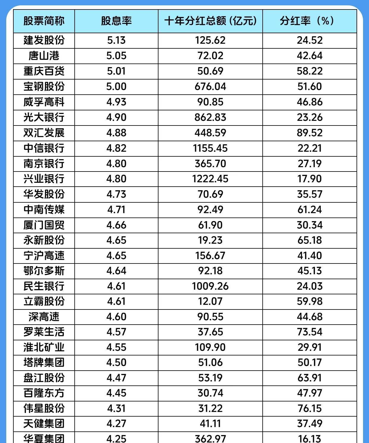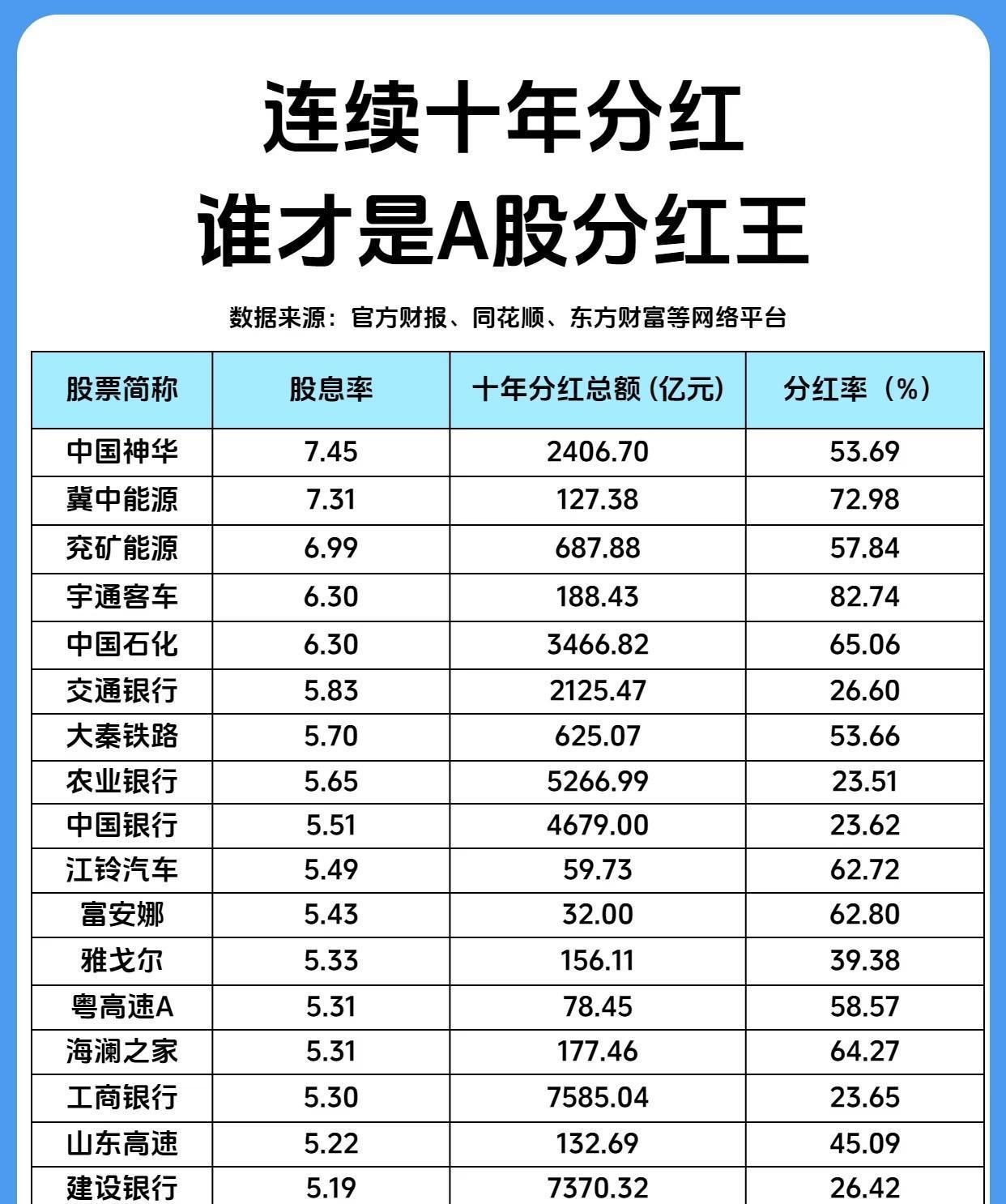 A股连续十年分红情况,通过不同维度展示了多支股票的分红表现。 投资者翻阅十年分红榜单时,笔尖在“分红率”一栏反复停顿——这组跨越能源、金融、消费等板块的数据,正用三个关键指标讲述着不同的故事:股息率、分红总额与分红率,如同三面镜子,照出企业对待利润的不同态度。 最刺眼的数字出现在双汇发展的89.52%与华夏集团的16.13%之间,近73个百分点的分红率差距,让“谁是分红王”的讨论失去了统一答案。 能源行业的中国神华给出了中间解:7.45%的股息率、2406.70亿元的十年分红总额,搭配53.69%的分红率,像位全能选手;而金融巨头工商银行则用7585.04亿元的分红总额稳坐头把交椅,只是23.65%的分红率,让它在“慷慨度”比拼中略显低调。 有观点认为,高分红率或许暗含隐忧——当双汇发展将近九成利润分给股东时,是否意味着企业扩张动力不足?反之,工商银行超7500亿元的分红总额,本质是万亿级资产规模下的“自然结果”,与其盈利基数直接挂钩。 更有趣的对比在消费与公用事业间展开:宇通客车以82.74%的分红率领先制造业,而长江电力1450.33亿元的分红总额,在电力板块一骑绝尘,可73.45%的分红率却让四方股份后来居上。 拆解数据会发现,高分红率公司多扎堆成熟赛道——双汇发展所在的食品加工、宇通客车所处的商用车领域,均属现金流稳定但增长天花板明显的行业,利润分配倾向于“即时反馈”;而工商银行、招商银行这类金融巨头,庞大的资产负债表决定了其盈利总额基数,即便分红率不足25%,绝对数值依然惊人。 那么,究竟该用总额还是分红率来定义“分红王”? 短期看,这给投资者出了道选择题:追求“落袋为安”的稳健派,会紧盯双汇、宇通的高分红率;偏爱规模效应的长期持有者,则更关注工行、招行的分红总额。 长远而言,这些数字早已超越“回报率”本身——它们是企业战略的量化表达:是选择将利润投入再生产,还是回馈股东,背后藏着行业周期与企业生命周期的密码。 当投资者的笔尖终于离开纸面,那份被圈出的“能源高分红率+金融高总额”的交叉清单,恰是A股市场最生动的注脚:没有绝对的“分红王”,只有不同生存逻辑下的价值呈现。