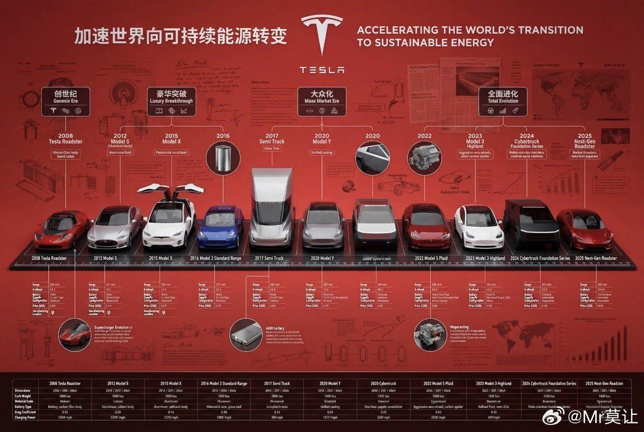 说点我的看法:1,特斯拉的“油改电”是2008年;2,2012年推出真正意义上的第一台特斯拉 Model S;3,2015年的Model X属于跑偏的作秀车型,成本高企,实用性不够提出,性价比成为特斯拉转型阶段的首要目标;4,Model 3将成本控制做到了极致,股价也是在这个阶段垂直升空,因为纯电的优势开始变得可以让老百姓触及;5,Model Y毫无疑问是百尺竿头的更进一步,个人认为是性价比的标杆车型;6,Cybertruck又是异想天开的试验性产品,如果能M i China,一定巨成功,可惜了…7,Semi Truck和Roadster挺好,刚开始那会概念新颖,现在不受投资人喜欢了,擎天柱机器人更好讲故事最后几句个人观点:特斯拉不能离开中国,因为最愿意实打实支持创新的只有这,希望FSD尽快落地,能在中国畅通运行的FSD才是含金量最高的自动驾驶辅助,希望特斯拉和老马能加快进程,等着这一天早日到来!