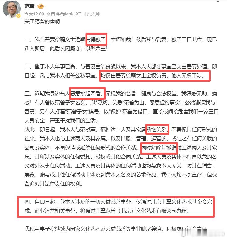 范曾宣布与女儿继子断绝关系信息量太大了,范曾是个狠人啊。发现这种二婚或者三婚的,与原配的子女基本上都没有好的关系。但是不得不说,这80多岁了还能老来得子真的是厉害。查了一下,范曾一共结婚四次,只有一个女儿是亲生的,两个儿子都是继子。说一下这个声明,核心的三点:第一、声明中第一句话就是“喜得独子”这四个字的含金量是相当大。猜测,大概以后家产都要留给独子了吧。其次,回应之前的被控制传言,声明是有人恶意挑起矛盾,也就是说是自己子女的问题。第三,核心权力全部转移,控制。直接断绝子女关系,猜测背后肯定矛盾非常大。然后女儿和继子都不能以其名号开展商业活动了,等于“断粮”了。然后所有业务,交给现任妻子徐萌全权负责,并强调他人无权干涉。这次声明甚至还是手写的,如果直接发微博肯定有人会怀疑真假,所以直接甩出了手写稿子,表明意识清醒,身体没问题。多重回应啊。这件事情后续还有没有转折不好说,毕竟还有亲生的子女,都是一家子。