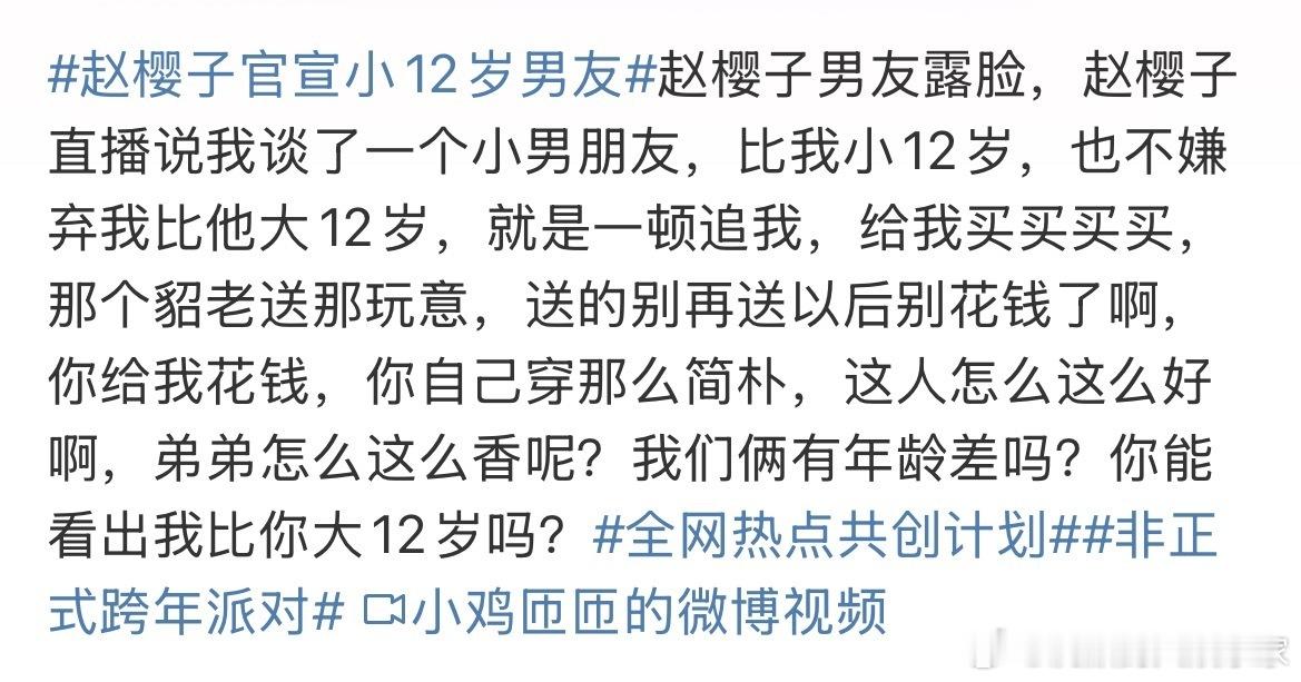 赵樱子终于官宣新恋情了,男友也出现在直播间,感情这事真是让人捉摸不透。赵樱子此前曾与双胞胎弟弟亲密搂腰,还说曾被制片人、顶.流男星、车银优等追求过。以为小12岁谈了个多帅的小奶狗呢,结果就这样,也看不出来小着12岁。。。网友对此戏称:“别拿感情分手当带.货,嘴里没有一句实话!”不知道这个姐是不是又在炒.作什么,我现在怀疑她每天都在胡说八道赵樱子官宣小12岁男友热点观点