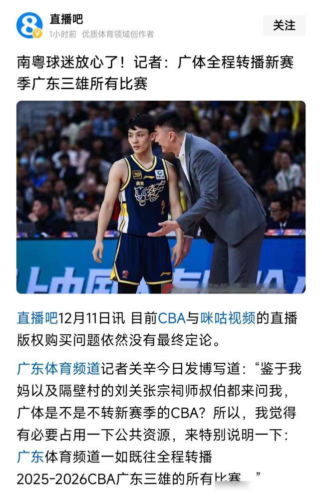 最新劲爆消息!广东体育频道记者关辛透露,广东体育频道会对25/26CBA赛季,
