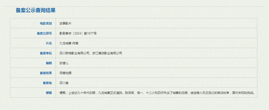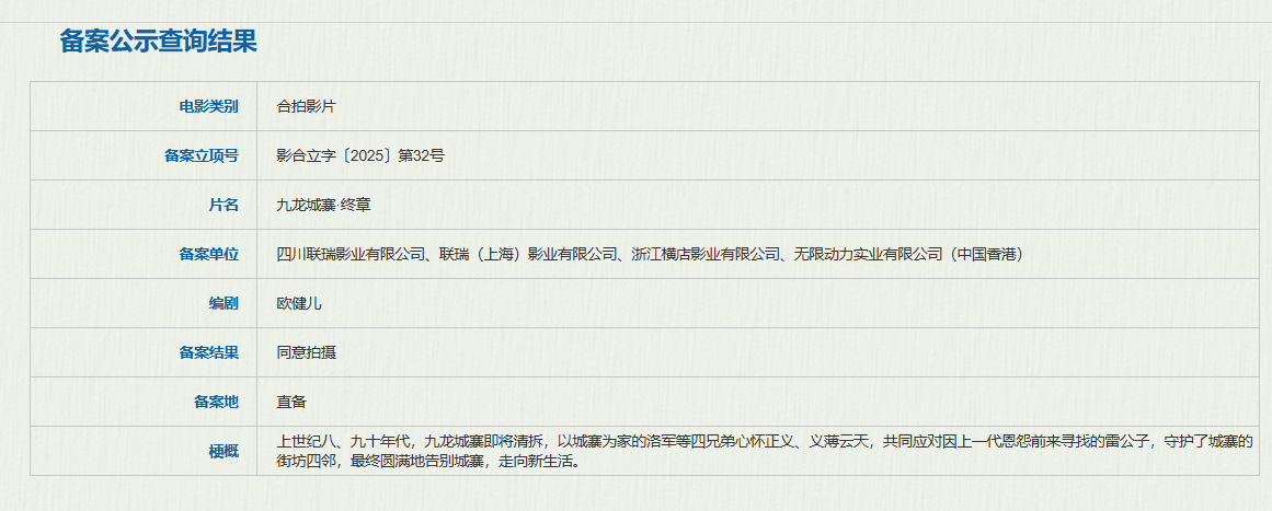 九龙城寨续集剧情梗概据国家电影局关于2025年11月上全国电影剧本(梗概)备案