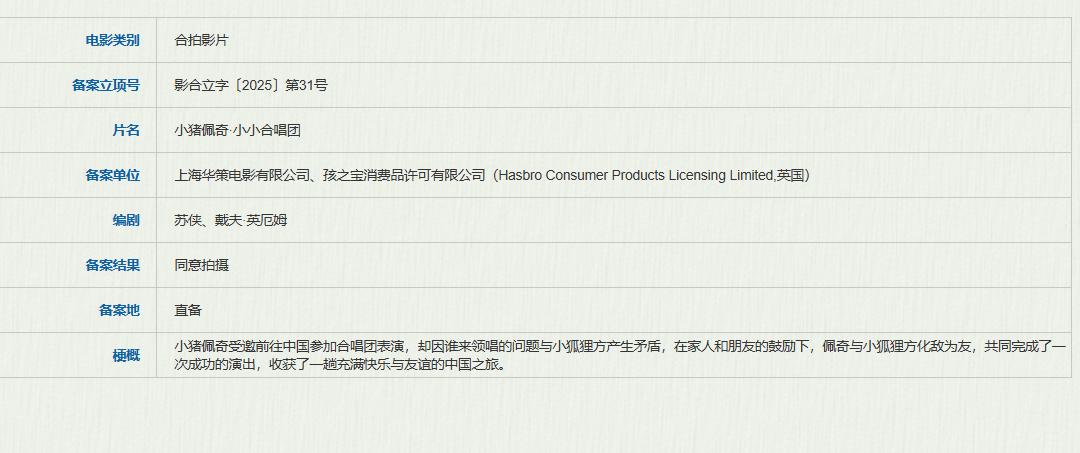 小猪佩奇小小合唱团立项 据国家电影局关于2025年11月上全国电影剧本(梗概)备案、立项公示的通知,合拍片《小猪佩奇·小小合唱团》备案立项。编剧为苏侠、戴夫·英厄姆(《小猪佩奇·完美假期》)。梗概:小猪佩奇受邀前往中国参加合唱团表演,却因谁来领唱的问题与小狐狸方产生矛盾,在家人和朋友的鼓励下,佩奇与小狐狸方化敌为友,共同完成了一次成功的演出,收获了一趟充满快乐与友谊的中国之旅。