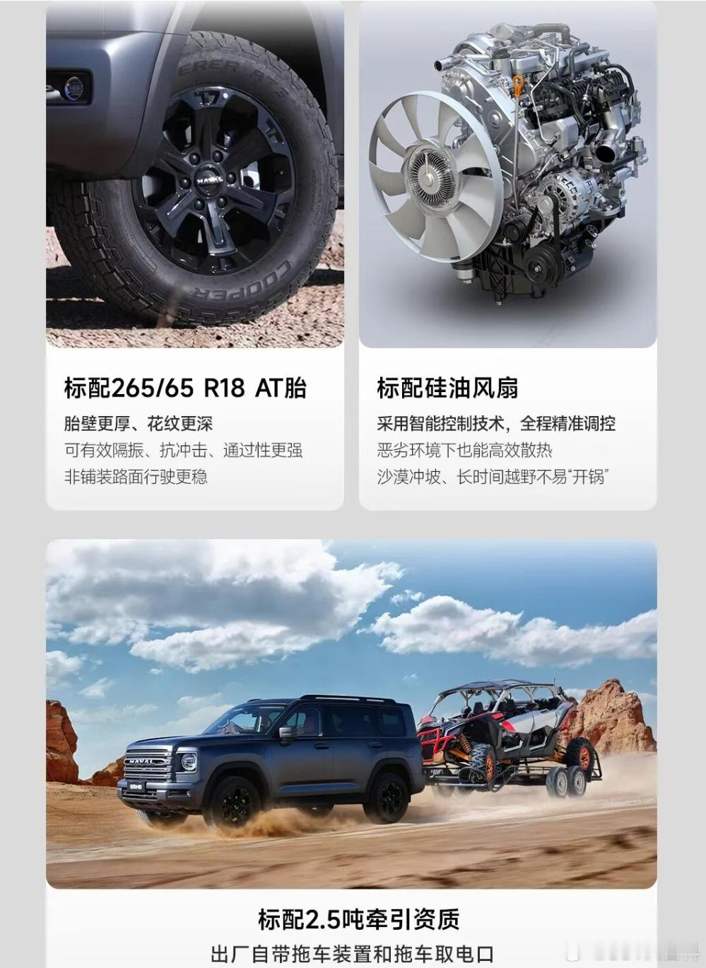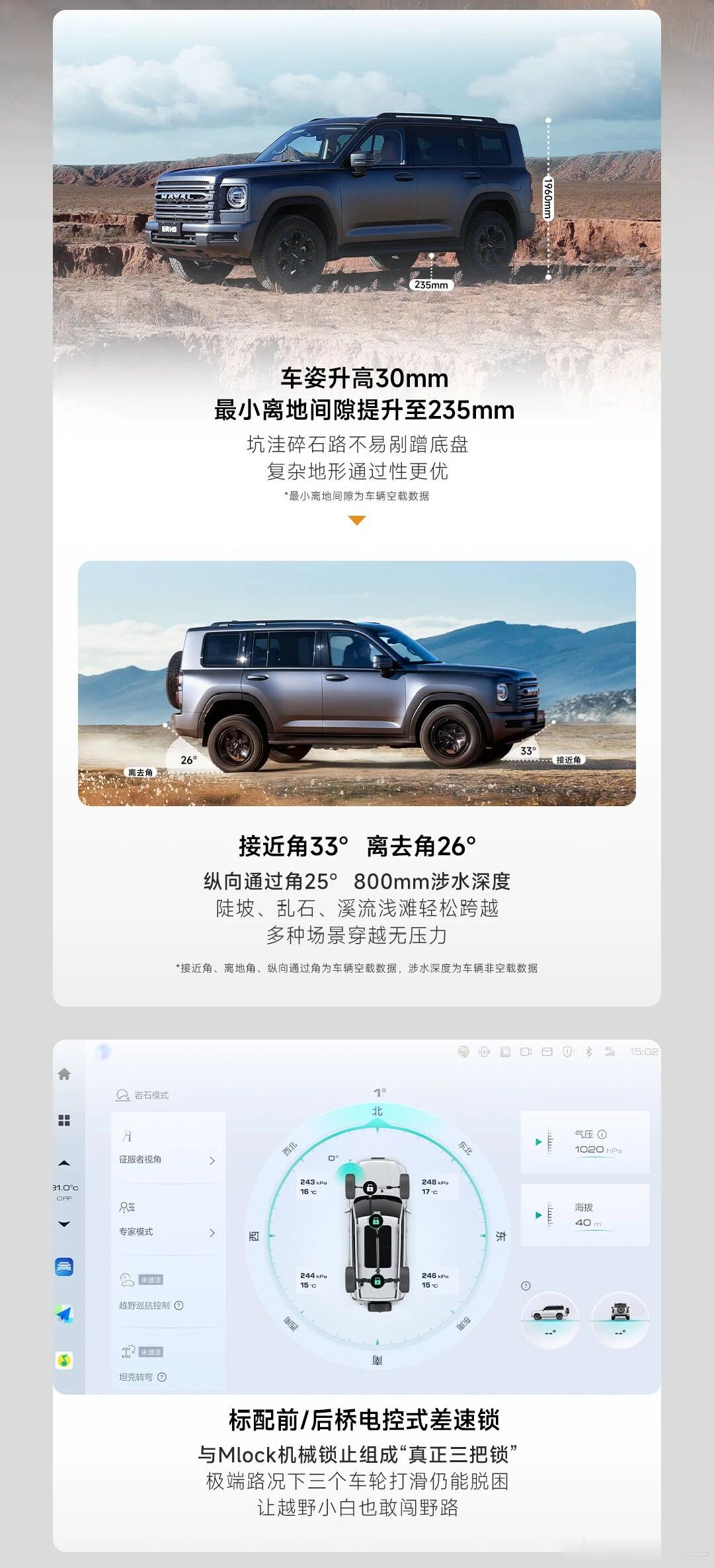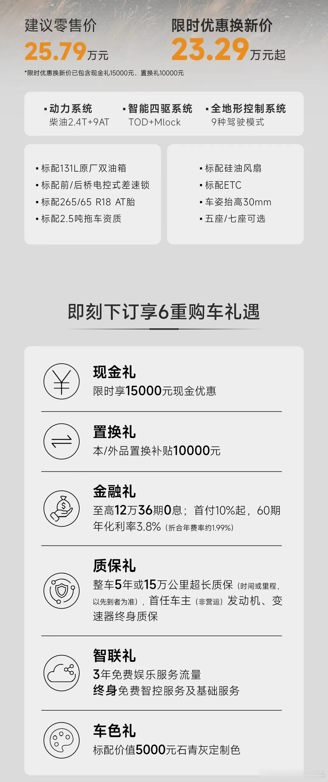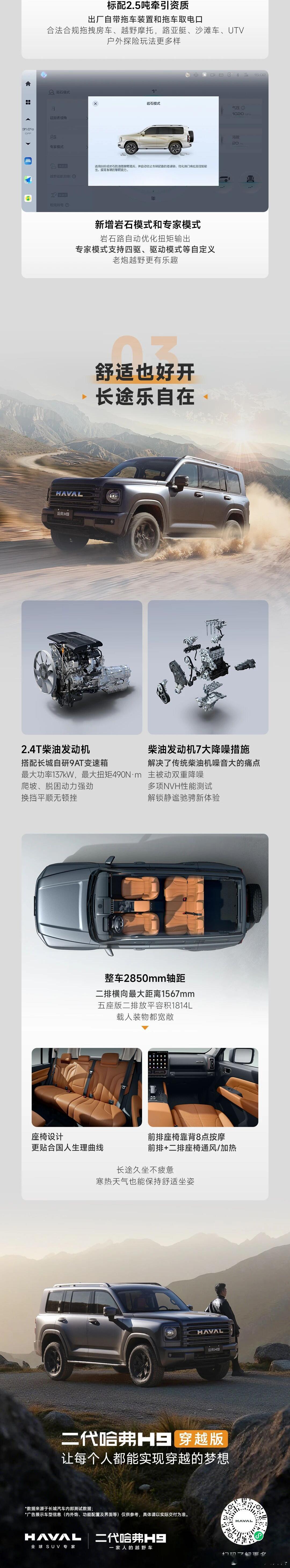 二代哈弗h9穿越版 正式上市,官方指导价25.79万元,限时优惠换新价23.29万元,购车可享现金礼(15000优惠)、置换礼(补贴10000)、金融礼(12万3年0息等)、质保礼、智联礼、车色礼穿越版提供全新灰色车漆,换装265/65 R18的AT胎,最小离地间隙+30mm为235mm,接近角33°、离去角26°、通过角25°,涉水深度800mm内饰依旧搭载14.6英寸中控屏+电子档杆,座椅布局有5座/7座可选,前排支持加热/通风/按摩,二排也具备通风/加热动力搭载2.4T柴油机+9AT+博格华纳TOD适时四驱,峰值输出137kW、490N·m,标配硅油风扇、131L原厂双油箱、前后电控限滑差速锁和2.5t牵引资质(自带拖车钩和取电口),提供9种驾驶模式(新增岩石、专家模式),综合续航1400kmSUV大百科 大v聊车