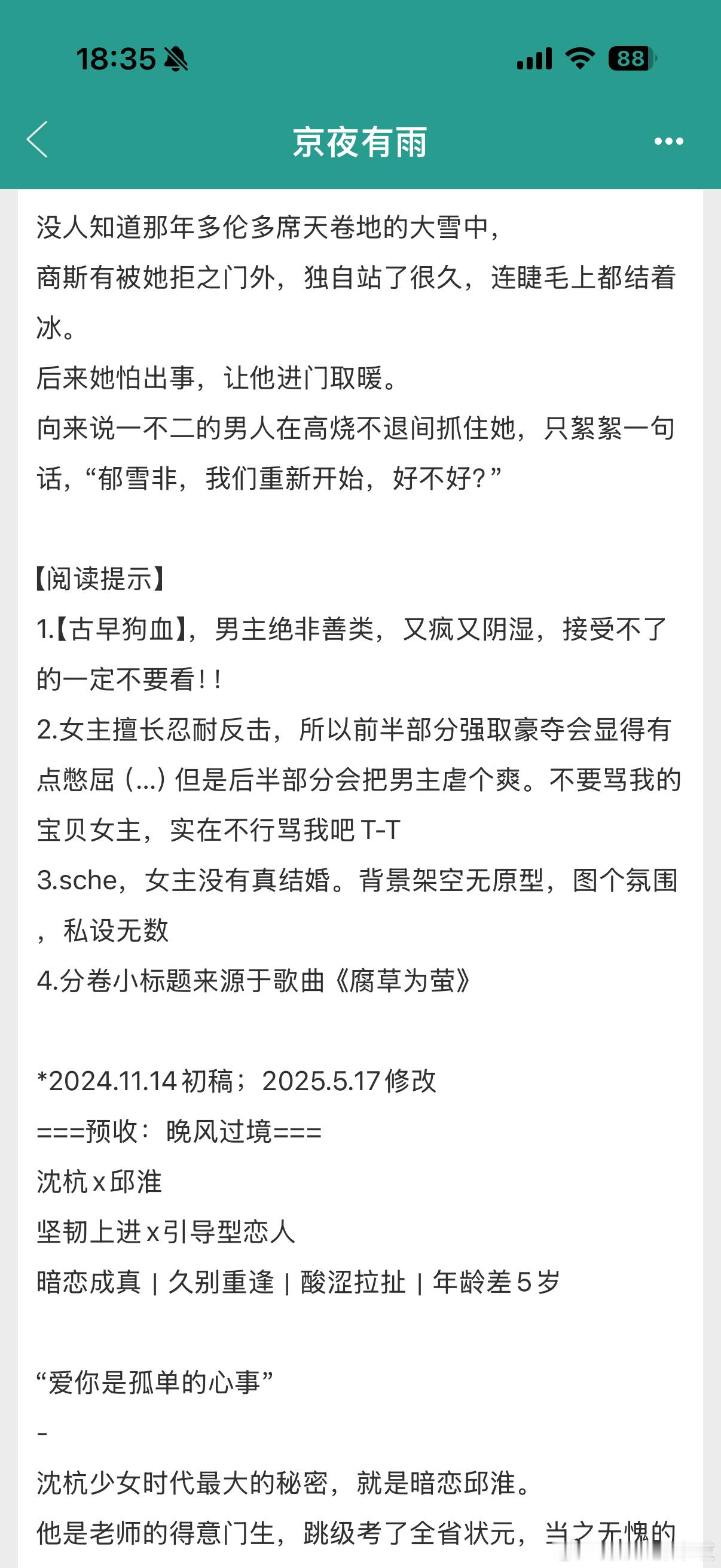 《京夜有雨》by却思京圈高干/破镜重圆/强取豪夺/正文完结就这个京圈高干向破镜重圆带感!斯文败类顶级权贵强取豪夺“温柔刀”清冷首席,堪比《京洛》的酸涩拉扯让我熬到八点!言情小说推荐推文小说好看的小说破镜重圆文破镜重圆小说推荐