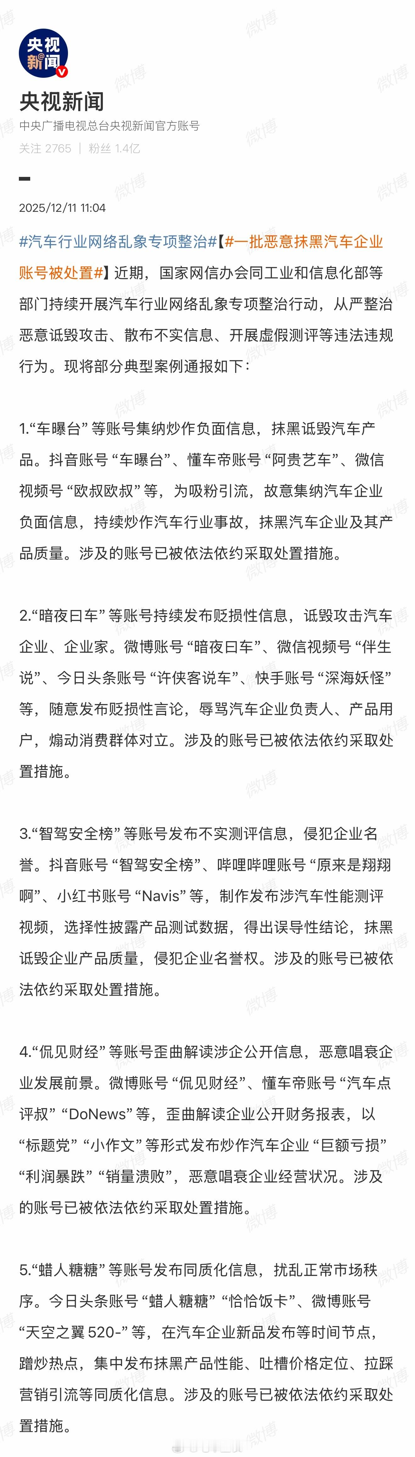 一批恶意抹黑汽车企业账号被处置又一批账号被封,其中有个账号的处理 很多车企公关会拍手叫好。