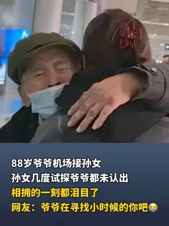88岁爷爷机场接孙女几度认不出 以为昨日孙尚小, 茫茫人海全神找。 童年身影怎会忘, 依稀牵着小棉袄。 音容笑貌足舞蹈, 常夸孙女手乖巧。 亭亭玉立今谁是? 对目数次竟不晓。 岁月无情催人老, 相拥夺眶爷可好? 儿孙尽孝宜当时, 余生慰聊还多少?