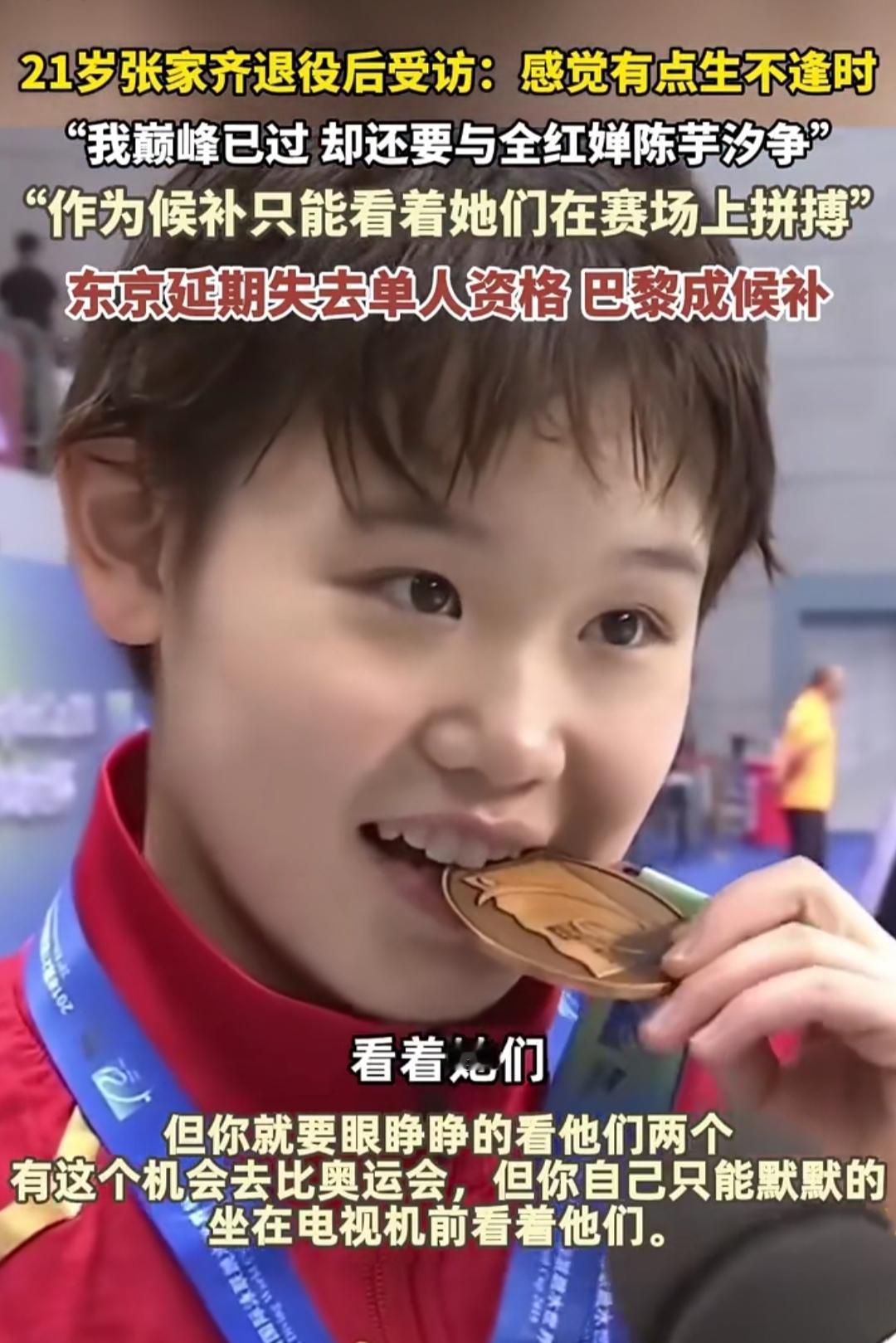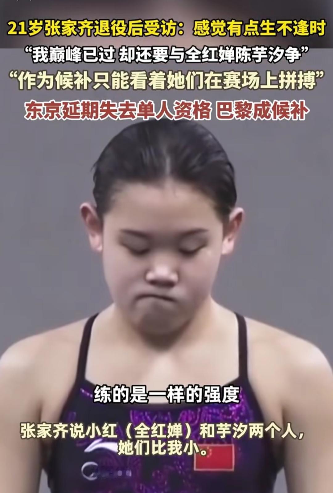 谁能想到21岁的奥运冠军张家齐,会带着一句“生不逢时”黯然退役?这话里的心酸,比她站在领奖台上的泪水更让人揪心。 她曾是跳水队的新星,17岁就拿下奥运金牌,可东京奥运延期打乱了节奏,单人资格旁落,巴黎奥运又只能做候补。看着全红婵、陈芋汐在赛场绽放,自己练着同样的苦,却连上场机会都没有。这份努力却没结果的无奈,戳中了太多运动员的痛点。 竞技体育从来残酷,黄金期就那么几年,错过了就是一辈子。张家齐不是不够优秀,只是恰好遇上了更年轻的天才选手,时机这东西,真的能左右一个运动员的一生。 赛场从不同情弱者,可那些拼尽全力却没能抓住机会的人,更值得被记住。愿张家齐退役后的路,能少些遗憾,多些坦途。