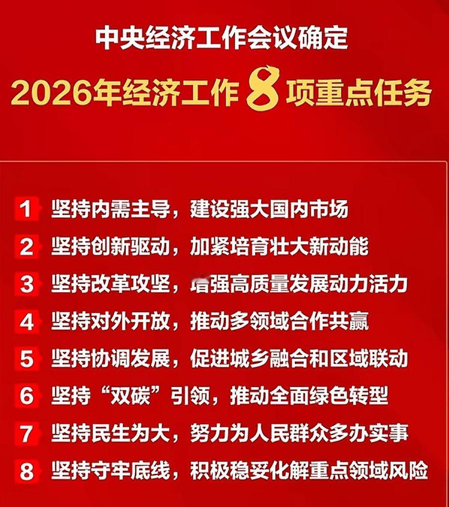 内需为首! 中央确定明年这样干 刚看完12月10日至11日召开的中央经济工作会议部署,最直观的感受就是“实在”! 把扩大内需放在八大重点任务首位,每一项安排都戳中老百姓和企业的心头事。 现在大家都能感觉到,外部环境挺复杂,进出口生意不好做,这时候把内需顶上来太关键了。 中央想得特别细,不仅要让大家敢花钱,还得让大家有钱花。 会议明确明年实施城乡居民增收计划,清理消费不合理限制,不管是买东西还是享受文旅、医疗等服务,都会更顺畅。 而且以旧换新补贴从3000亿提升至5000亿,支持范围扩展到日常消费和服务领域,这日子过得更有奔头了。 投资方面也不搞虚的,重点放在“两重”项目和设备更新上。 根据政策部署,2026年超长期特别国债规模将增至2万亿左右,地方专项债也会从今年的4.4万亿元适当增加,这些钱都会用到实处,既拉动经济,又能改善咱们的生活环境。 更让人放心的是,会议提出有效激发民间投资活力,让中小企业能有更多参与机会。 除了促消费、扩投资,民生保障也没落下。 就业上,稳定高校毕业生、农民工等重点群体就业,支持灵活就业人员参加职工保险; 医疗上,优化药品集中采购、深化医保支付方式改革,进一步减轻看病负担;房地产方面,因城施策促进良性循环和健康发展,既去库存又建“好房子”,让大家买房住房更安心。 这些政策就像给生活上了“双保险”,让人心里踏实。 还有科技创新和风险防控,一边给制造业、科技领域更多资金支持,培育新产业新业态,一边稳妥化解房地产、地方债务等重点领域风险,不让发展出岔子。 这种既往前冲又守底线的安排,让人对明年的经济有信心。 总的来说,明年的政策没有空话,全是实打实的举措。从口袋里的收入到日常消费,从就业保障到住房医疗,都考虑到了。 只要这些政策落地见效,大家消费有底气、企业发展有信心,经济肯定能稳中有进,咱们的日子也会越过越红火。 你对人生有哪些感悟