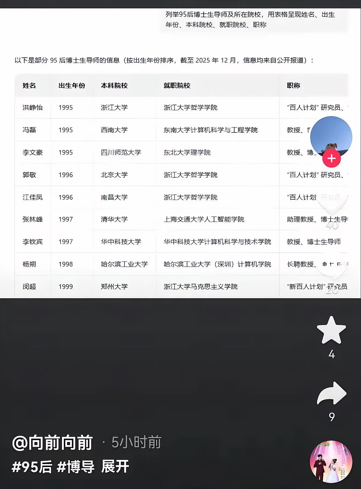 浙江大学不拘一格降人才: 1999年的闵超博士成为浙江大学马克思学院博导,可能是最年轻的博导比较引人瞩目, 实际上浙江大学还有三位博导年龄也不大:1995年的洪峥怡,1996年的郭敬与江佳凤,他们三人和闵博导同样是百人计划研究员。 他们三人是浙江大学哲学学院,只有闵超博导是浙江大学马克思主义学院。 浙江大学的哲学和马克思主义理论专业在顶级学校里不是最强的,启用这些年轻的青年才俊,再下一轮学科评比中,就有可能步入最强之列。 欢迎条友发表看法。普通人读博有哪些出路 读博和本科最大的区别之一是什么? 浙大法学本科如何保研 26岁博导闵超学术成就有多高 博士怎么样才能留校 浙大毕业的人是什么样的?