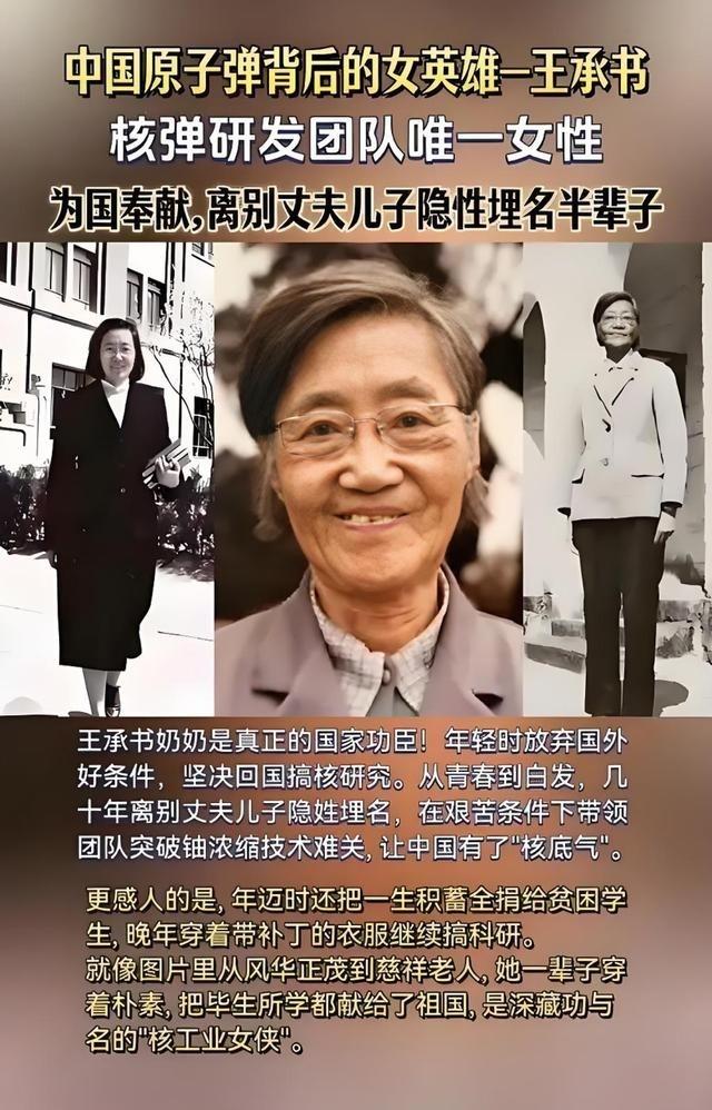 1960年,北大才女王承书扔下丈夫儿子不辞而别,丈夫张文裕翻遍北京城找不到人。17年后,一个白发老太太站在家门口,儿子愣住了,突然冲过去抱着她嚎啕大哭。 王承书1912年出生在上海一个书香家庭,父亲是清末进士,曾在日本留学,母亲来自扬州名门。她从小在北京长大,对数学和物理表现出浓厚兴趣。1924年进入教会学校学习,1930年保送燕京大学物理系,成为班里唯一女生。大学期间,她专注量子力学和相对论研究,成绩突出。1934年以全校第一毕业,获得学士学位,两年后完成硕士论文,留在学校担任助教。她参与多项物理实验,推动学校科研进步。她的早期教育奠定了坚实基础,为后来国际研究打下根基。她在燕京大学期间接触先进物理理论,激发了对气体动力学的探索欲。 1941年,王承书获得巴尔博奖学金,尽管规定不适用于已婚妇女,她仍成功申请赴美留学。丈夫张文裕随后跟来。她进入密歇根大学,师从物理学家乌伦贝克,开展气体输运理论研究。1944年获得博士学位,提出多原子气体输运方程,这个成果在国际物理界引起关注,被称为王承书方程。导师乌伦贝克认为她有潜力获得诺贝尔奖。她随后转入普林斯顿高等研究院,继续气体分子运动论工作,发表多篇论文。她的研究聚焦气体扩散和热传导,填补了理论空白。她在美国期间积累了大量实验数据,推动了相关领域的计算方法发展。 新中国成立后,王承书决定回国。她和丈夫在美国公寓生活五年,提交15次回国申请均遭拒绝。1954年,通过日内瓦谈判,用美军战俘交换科学家,他们才得以返回。她携带大量书籍和笔记登上轮船。回国后,她在中国科学院近代物理研究所任职,同时在北京大学物理系任教。她讲授核物理课程,指导学生实验。1958年,她转向热核聚变领域,带领团队翻译苏联资料,出版专著,成为该方向重要人物。她的教学工作促进了北大物理系的学科建设,培养出一批年轻研究员。 1960年,王承书接受二机部副部长钱三强邀请,改行从事铀浓缩研究。她前往甘肃兰州,参与国家原子弹核心燃料生产任务。这一去就是十七年,期间隐姓埋名,与家人断绝联系。丈夫张文裕在北京多处寻找无果。她在西北荒漠的科研基地工作,面对艰苦环境,使用手摇计算器进行理论计算。1961年苏联专家撤走,她带领团队自力更生,解决级联方程问题。她的工作聚焦铀同位素分离理论,确保浓缩铀纯度达到要求。她组织净化级联研究,与同事合作攻克技术难题,推动工厂设备调试。 在甘肃基地,王承书负责铀浓缩技术总指挥。她指导团队使用国产计算机验证数据,晚上校对计算结果。1962年,她参与求解级联方程,抓住主要矛盾,优化分离过程。她的计算方法提高了铀浓度精度,避免了生产偏差。1963年,团队面临设备故障,她推动改进计算模型,确保项目进度。1964年1月,第一批高浓铀产品产出,为原子弹研制提供关键材料。十个月后,新疆罗布泊原子弹爆炸成功,她的贡献直接支撑了这一成就。她继续优化第二批设备,完善理论框架。 王承书的铀浓缩工作涉及气体扩散法,她提出多级级联理论,奠定我国核燃料生产基础。她的研究成果应用于504厂,推动铀同位素分离工业化。她担任605所副所长,协调科研资源,培训技术人员。她的论文集《气体运动论》于1994年出版,汇总了早期和后期工作。她在核物理领域的转变体现了专业适应性,从理论物理到工程应用。她推动中国核工业从依赖进口到自主发展,填补了技术空白。 1978年,王承书返回北京,与家人团聚。她头发全白,手背留有计算器磨损痕迹。她继续在中科院核理化研究所指导工作,1980年当选中国科学院院士。她的院士身份认可了在铀同位素分离的开创性贡献。她参与多项核技术项目,分享经验给年轻科学家。她的晚年研究聚焦核燃料循环,提出优化建议,推动行业标准制定。她捐赠积蓄用于教育,体现了对国家发展的持续支持。 丈夫张文裕1992年去世后,王承书将半生积蓄捐给西藏萨迦县建文裕小学。她住在旧单元房,使用煤球炉生活。1994年病重,她交待不办葬礼、遗体捐给医学院、存款给希望工程。她于6月18日逝世,存折剩10元。遗嘱强调平凡实在、勤恳做事。中国核工业集团大楼石碑刻有她的名字,标明铀浓缩技术总负责人。她的手摇计算器展出,按键凹坑见证了计算强度。她的贡献影响了后续核技术发展,推动了我国核工业自主化。