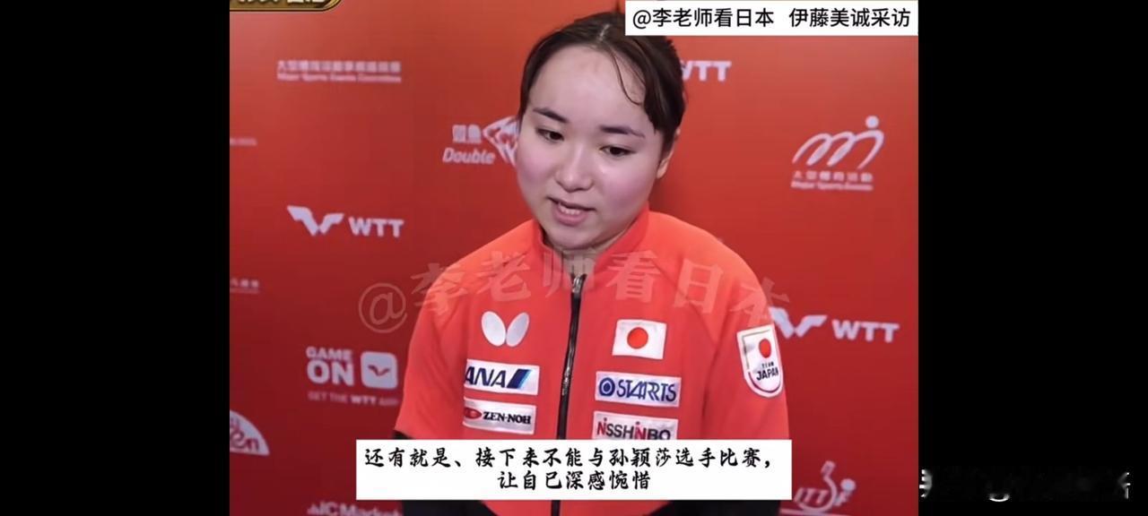 伊藤美诚是真的很喜欢莎莎啊。 伊藤美诚赛后采访说:“这次没能赢下来,还是挺可惜的。还有就是接下来不能与孙颖莎选手比赛,让自己深感惋惜。”伊藤确实今天输的有点可惜,自己大比分领先,第六局还先拿到三个赛点都没有赢下来,当时长崎一直追分,伊藤也没有叫暂停,愣是把暂停留在了决胜局,到了决胜局伊藤就有点掉线了,被长崎美柚逆转赢了。 确实队友之间的比赛都不好打啊,长崎美柚赢下比赛后,在内场采访的时候还秀中文说:“大家好,谢谢”,日本女队是大藤沙月、长崎美柚晋级了女单8强,长崎美柚下一轮对阵王艺迪和孙颖莎之间的胜者。在比赛开始前,参赛球员到了香港,主办方为大家拍了合影,当时就看到伊藤美诚和大藤沙月跟莎莎合影,早田希娜在那给拍照,四个女孩子在一起都很开心。伊藤和莎莎也是从小打到大的对手和朋友,伊藤很喜欢莎莎。 大藤沙月也在莎莎的半区,下一轮的女单1/4决赛大藤沙月将对阵蒯曼,蒯曼今晚是4-0赢了早田希娜,看得出来蒯曼赛前准备很充分,接下来继续加油哦!莎莎和大迪的比赛还没结束,目前莎莎大比分2-0领先,两个人都加油!