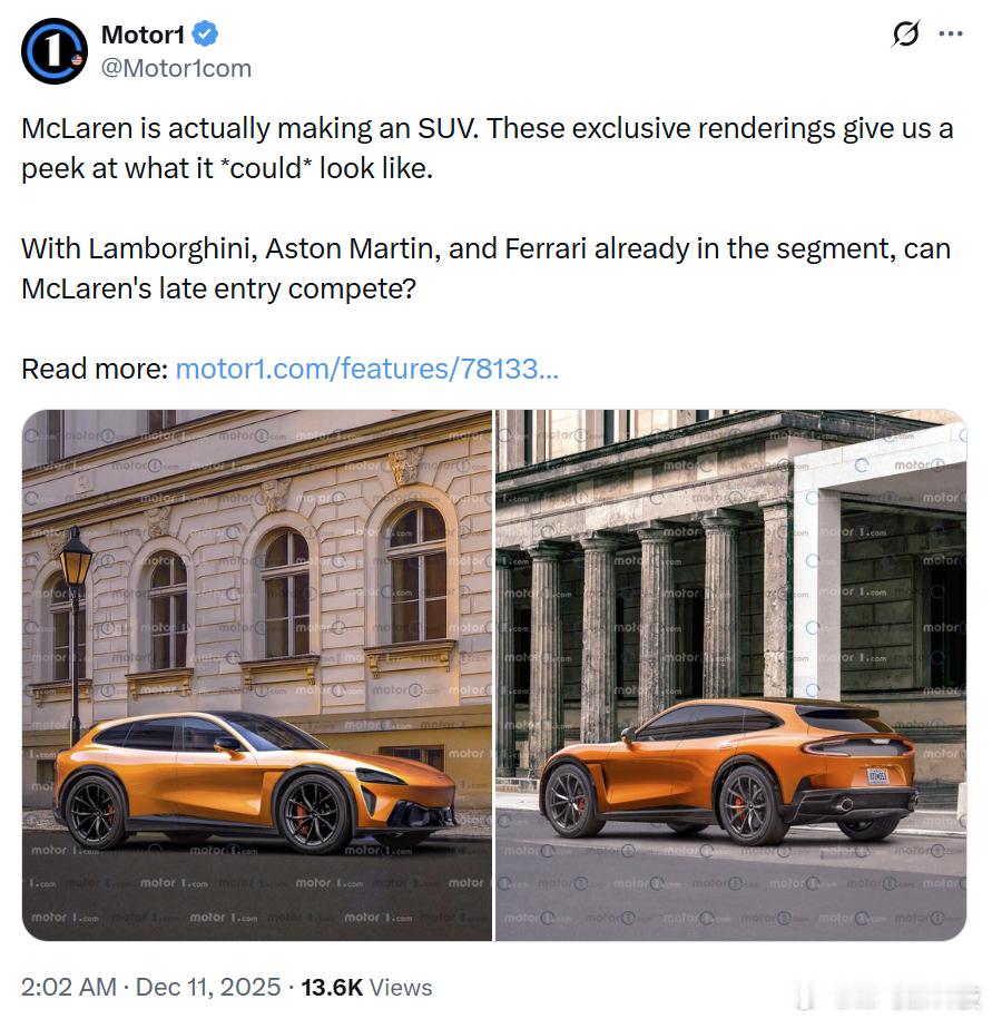 【迈凯伦首款SUV,神似小米YU7】迈凯伦在上个月向经销商展示五座混合动力SUV模型。外媒根据目前已知信息绘制了效果图,不过这个设计与小米YU7高度神似。。参观模型的经销商描述该车“雕塑感十足且充满力量感”,并且“在豪华SUV市场中依然惹眼”。