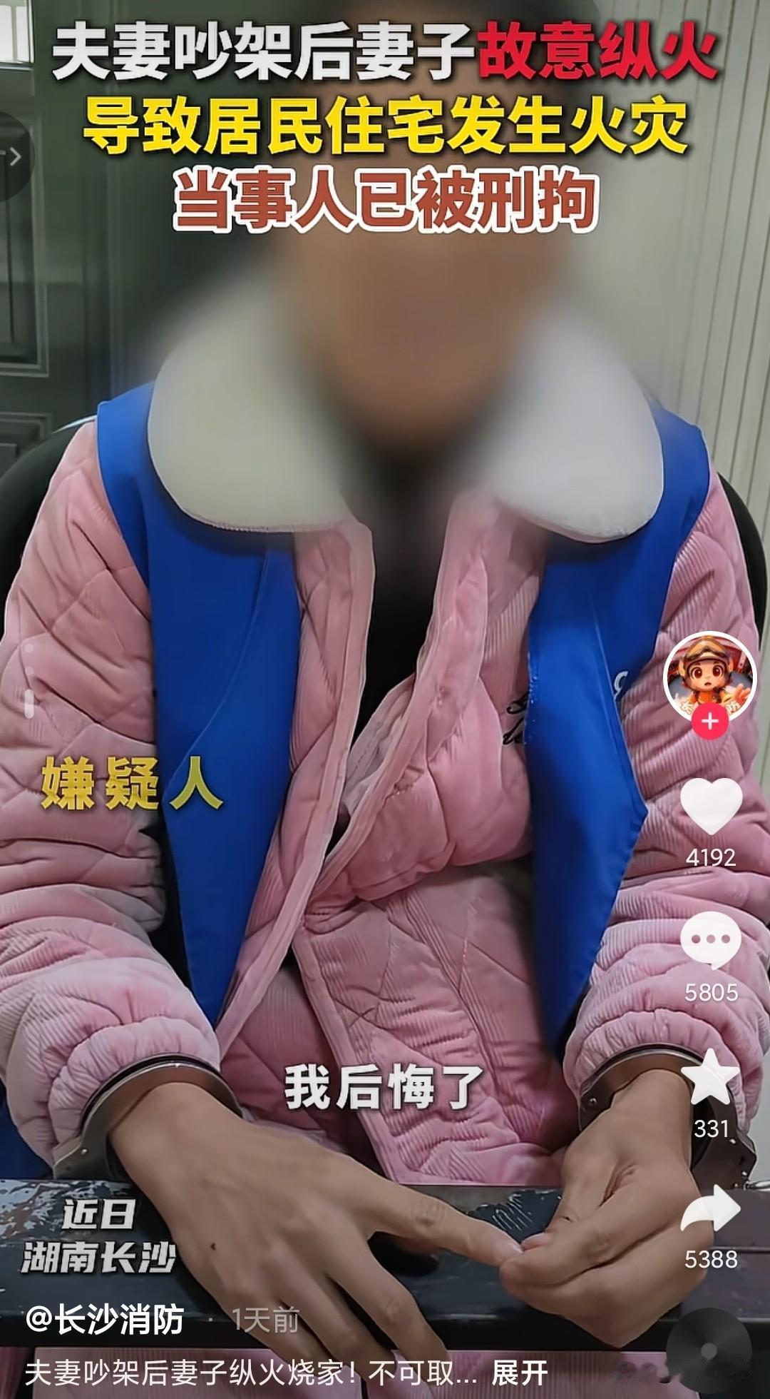 怎么还跟个小孩子一样? 和丈夫吵架就威胁他要把房子烧了,现在才知道有一个情绪稳定的伴侣是多么重要的事。 她不仅说,还真就这么干了,双方吵架,家务分工以及生活开销,妻子认为自己为了这个家付出太多,没有回报,积累的委屈一涌而出,争吵时的互不相让戳中了对方的痛点,女方一气之下,拿起打火机点燃了小卧室的可燃物,想以此吓唬丈夫、宣泄怒火。 等火变得越来越大,就察觉到了不对劲,已经无法挽回了,用这样的事来要挟丈夫妥协,这种事情她应该不少做,这房子要是她买的话,她绝对舍不得烧。 因为她的一时糊涂,自己家没了,邻居家也受到了波及,还要赔钱。 现在哭有什么用,真好,可以去监狱里面想想。