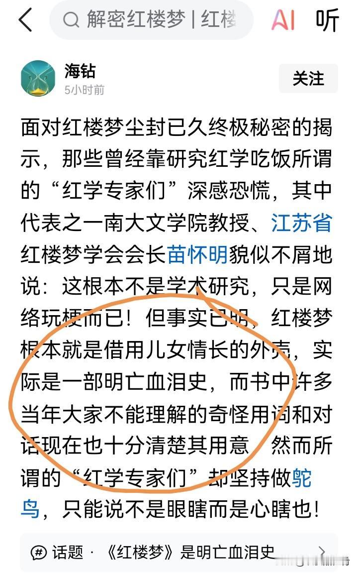 南大苗怀明教授说“《红楼梦》是明亡血泪史”是网络玩梗,不是学术研究。可有人觉得事实都明摆着,“红学专家”却像鸵鸟一样。这就好比大家在一个大舞台上各唱各的戏。 “明亡血泪史”的说法在网上热度不低,很多网友有自己的解读和证据。但教授站在学术角度,可能觉得这缺乏严谨论证。 为什么专家总是跟老百姓的看法相悖呢?其实时至今日红楼梦具体是什么已经不重要了,因为那些所谓的红学专家也不重要了,红楼梦的中华血泪史,让汉族同胞又一次看到了自己的辉煌历史和文化, 以及他是如何被毁灭的,这就够了。