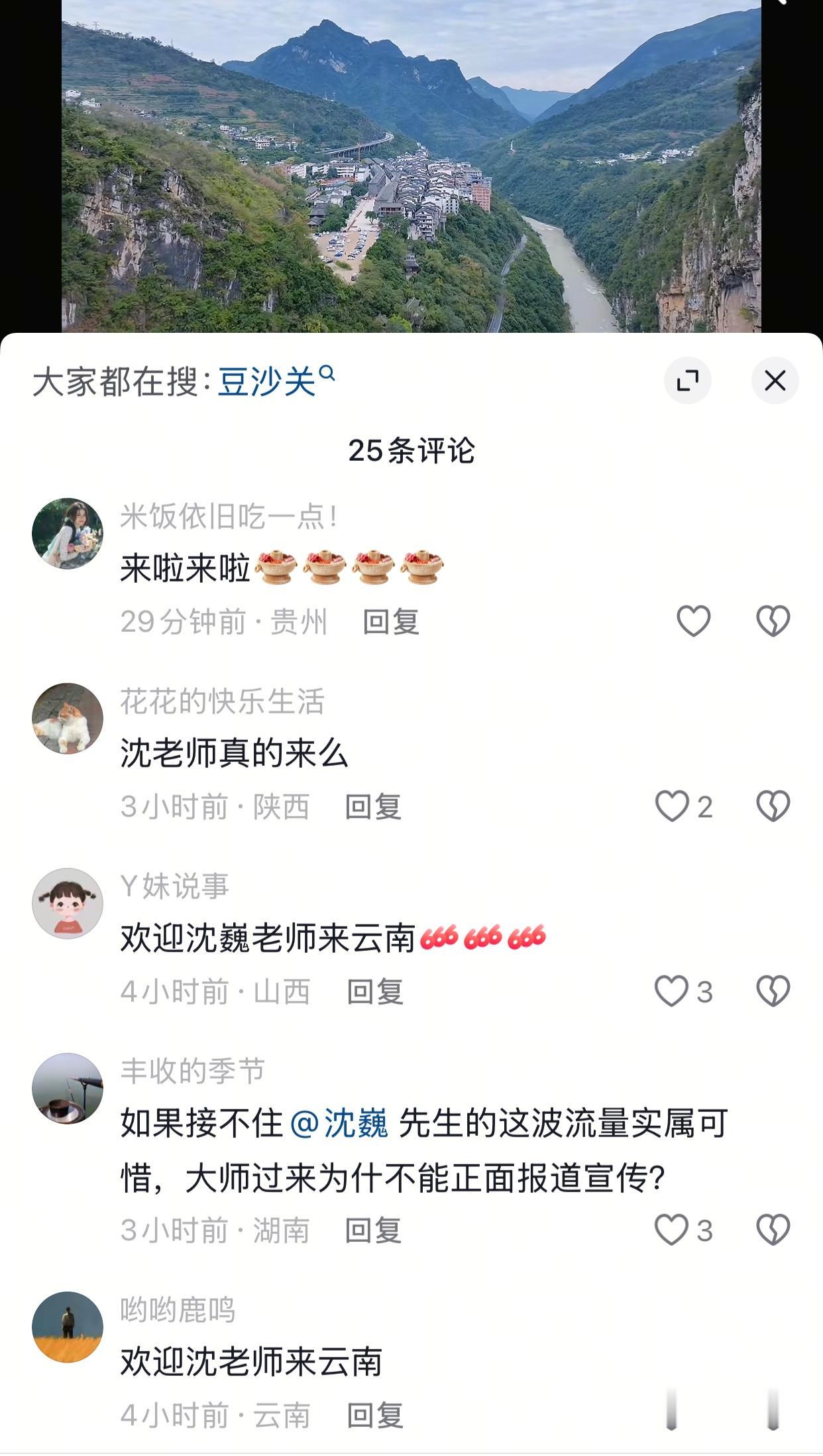 沈巍云南行,还没到云南,网友们已经到云南文旅账号下打卡[捂脸]已经打卡两天了,想知道一些关于沈巍云南行的消息,但是官方并没有透露任何消息。网友希望云南文旅能够接住沈巍这一波流量,好好宣传云南。 沈巍这一次出门,可以说是横跨整个中国了,从上海坐小车,一路奔驰,2000多公里路程,估计要到12日才能到达目的地。