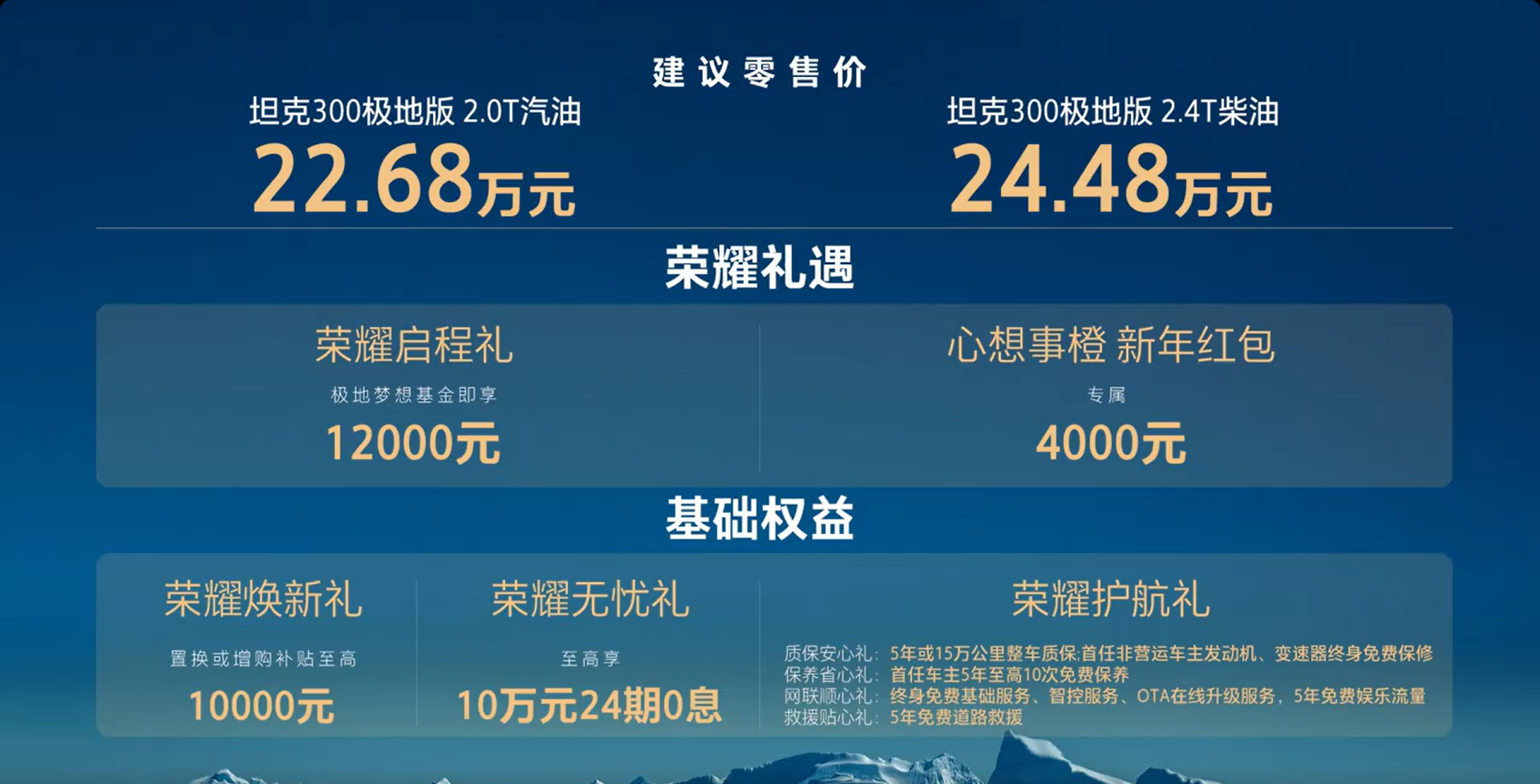 12月11日,坦克品牌与用户共创坦克300的第14个限定版本——坦克300极地版 正式上市,两款车型,售价22.68、24.48万元。该特别版车型的背景为坦克300作为"中国南北极考察选用产品" ,登陆南极,执行中国第42次南极科考任务。接下来,一起随着新车划重点 了解它!新车情报局 1、【车身特殊拉花彰显身份】坦克300极地版采用了极具辨识度的“极地橙”配色,搭配专属车身拉花、翼子板上的徽章、头枕上的烫印logo,彰显了其特别版的身份;2、【增加极寒配置】增加远程控制前风挡加热、自动玻璃水喷嘴加热功能,这样的设计可以确保车辆在极寒环境下也能带来更好的使用便捷性。轮胎方面,这款车带来了原厂AT全地形轮胎,面对复杂路况也可轻松拿捏;3、【救援/脱困双在线】该车自带2.5吨的拖拽资质,同时在车头部分配备了9500磅无线遥控绞盘。这两项功能对于车辆在雪地脱困具有很不错的保障属性;4、【动力猛四驱强】动力提供2.4T柴油与2.0T汽油两种选择,其最大功率分别为137kW和167kW,并配备前后桥电控差速锁及拥有十种驾驶模式的MTS全地形系统。