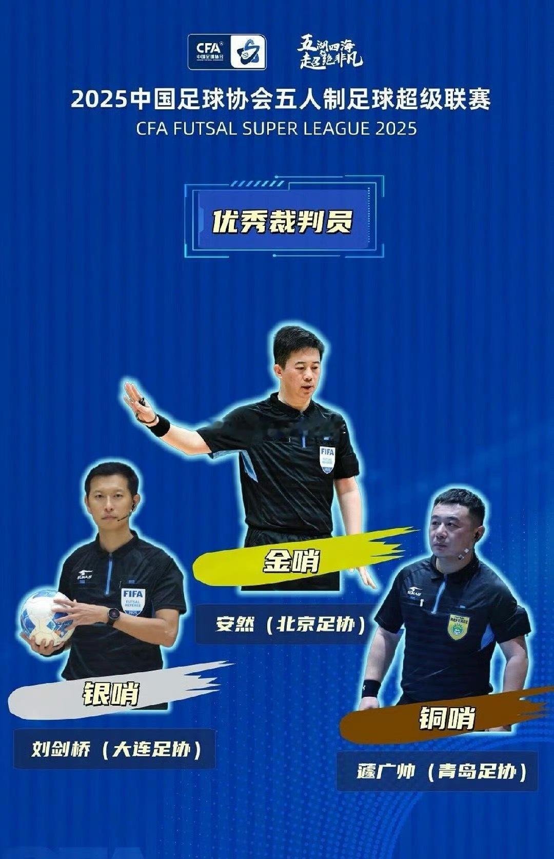 2025年中国足球协会五人制超级联赛优秀裁判员:金哨:安然(北京)银哨:刘剑桥(大连)铜哨:蘧广帅(青岛)中超联赛