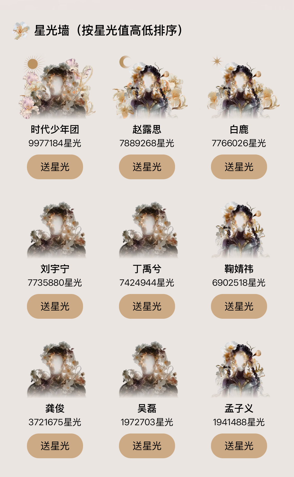 这两天投得热火朝天的星光墙真的让🐧大赚一笔一共就六个“出道位”只要进去了就会被架住,沉默成本太高,为了稳住只好氵得氵、氪得氪,前六大断档后,今晚上吴磊粉丝又突然蹦出来,奔着前六去,疑似拉人逼氪,好多家涨幅异常得跟实际流量完全不对等…… 吴磊星光值暴涨